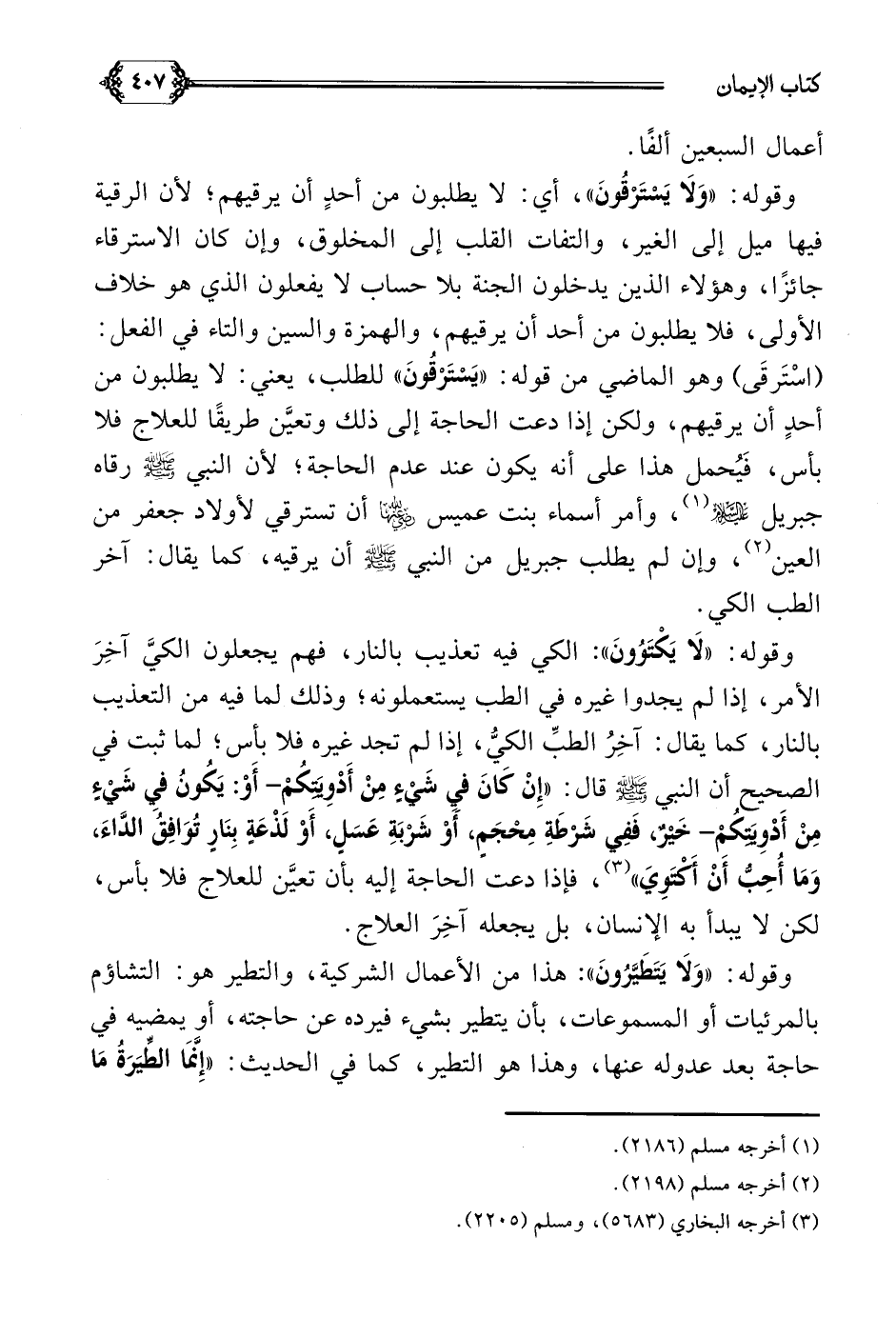 وقوله: ((وَلَا يَسْتَرْقُونَ))، أي: لا يطلبون من أحدٍ أن يرقيهم؛ لأن الرقية فيها ميل إلى الغير، والتفات القلب إلى المخلوق، وإن كان الاسترقاء جائزًا، وهؤلاء الذين يدخلون الجنة بلا حساب لأنهم لا يفعلون الذي هو خلاف الأولى، فلا يطلبون من أحد أن يرقيهم، والهمزة والسين والتاء في الفعل: (اسْتَرقَى) وهو الماضي من قوله: ((يَسْتَرْقُونَ)) للطلب، يعني: لا يطلبون أحدًا أن يرقيهم، ولكن إذا دعت الحاجة إلى ذلك وتعيَّن طريقا للعلاج فلا بأس، فَيُحمل هذا على أنه يكون عند عدم الحاجة؛ لأن النبي صلى الله عليه وسلم رقاه جبريل عليه السلام (¬١)، وأمر أسماء بنت عميس رضي الله عنها أن تسترقي لأولاد جعفر من العين (¬٢)، وإن لم يطلب جبريل من النبي صلى الله عليه وسلم أن يرقيه، كما يقال: آخر الطب الكي.