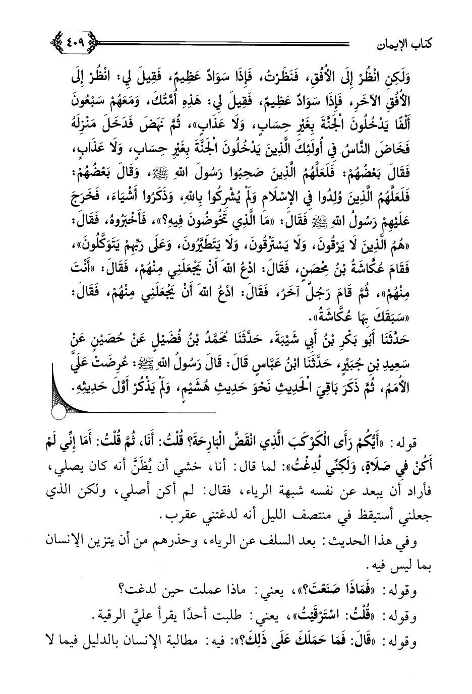 وَلَكِنِ انْظُرْ إِلَى الأُفُقِ، فَنَظَرْتُ، فَإِذَا سَوَادٌ عَظِيمٌ، فَقِيلَ لِي: انْظُرْ إِلَى الأُفُقِ الآخَرِ، فَإِذَا سَوَادٌ عَظِيمٌ، فَقِيلَ لِي: هَذِهِ أُمَّتُكَ، وَمَعَهُمْ سَبْعُونَ أَلْفًا يَدْخُلُونَ الْجَنَّةَ بِغَيْرِ حِسَابٍ، وَلَا عَذَابٍ))، ثُمَّ نَهَضَ فَدَخَلَ مَنْزِلَهُ فَخَاضَ النَّاسُ فِي أُولَئِكَ الَّذِينَ يَدْخُلُونَ الْجَنَّةَ بِغَيْرِ حِسَابٍ، وَلَا عَذَابٍ، فَقَالَ بَعْضُهُمْ: فَلَعَلَّهُمُ الَّذِينَ صَحِبُوا رَسُولَ اللَّهِ صلى الله عليه وسلم، وَقَالَ بَعْضُهُمْ: فَلَعَلَّهُمُ الَّذِينَ وُلِدُوا فِي الإِسْلَامِ وَلَمْ يُشْرِكُوا بِاللَّهِ، وَذَكَرُوا