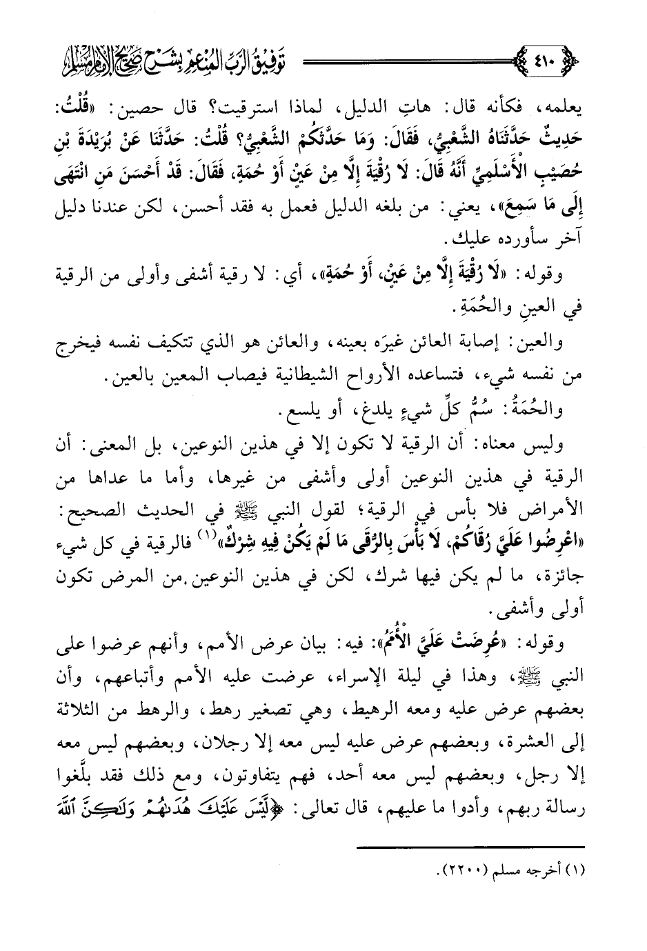 وليس معناه: أن الرقية لا تكون إلا في هذين النوعين، بل المعنى: أن الرقية في هذين النوعين أولى وأشفى من غيرها، وأما ما عداها من الأمراض فلا بأس في الرقية؛ لقول النبي صلى الله عليه وسلم في الحديث الصحيح: ((اعْرِضُوا عَلَيَّ رُقَاكُمْ، لَا بَأْسَ بِالرُّقَى مَا لَمْ يَكُنْ فِيهِ شِرْكٌ)) (¬١) فالرقية في كل شيء جائزة، ما لم يكن فيها شرك، لكن في هذين النوعين من المرض تكون أولى وأشفى.