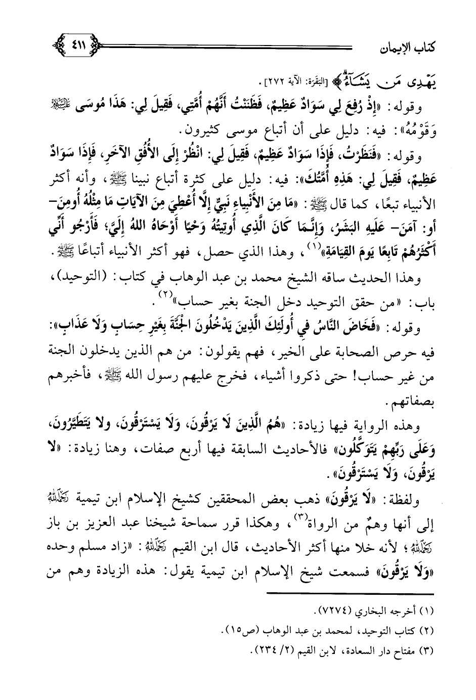 وهذا الحديث ساقه الشيخ محمد بن عبد الوهاب في كتاب: (التوحيد)، باب: ((من حقق التوحيد دخل الجنة بغير حساب)) (¬٢).