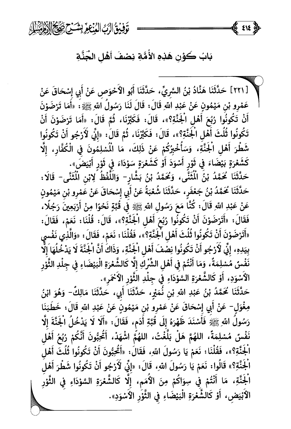 [٢٢١] حَدَّثَنَا هَنَّادُ بْنُ السَّرِيِّ، حَدَّثَنَا أَبُو الأَحْوَصِ عَنْ أَبِي إِسْحَاقَ عَنْ عَمْرِو بْنِ مَيْمُونٍ عَنْ عَبْدِ اللَّهِ قَالَ: قَالَ لَنَا رَسُولُ اللَّهِ صلى الله عليه وسلم: ((أَمَا تَرْضَوْنَ أَنْ تَكُونُوا رُبُعَ أَهْلِ الْجَنَّةِ؟ ))، قَالَ: فَكَبَّرْنَا، ثُمَّ قَالَ: ((أَمَا تَرْضَوْنَ أَنْ تَكُونُوا ثُلُثَ أَهْلِ الْجَنَّةِ؟ ))، قَالَ: فَكَبَّرْنَا، ثُمَّ قَالَ: ((إِنِّي لَأَرْجُو أَنْ تَكُونُوا شَطْرَ أَهْلِ الْجَنَّةِ، وَسَأُخْبِرُكُمْ عَنْ ذَلِكَ، مَا الْمُسْلِمُونَ فِي الْكُفَّارِ، إِلَّا كَشَعْرَةٍ بَيْضَاءَ فِي ثَوْرٍ أَسْوَدَ أَوْ كَشَعْرَةٍ سَوْدَاءَ فِي ثَوْرٍ أَبْيَضَ)).