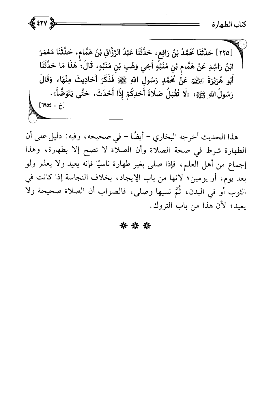 هذا الحديث أخرجه البخاري- أيضًا- في صحيحه، وفيه دليل على أن الطهارة شرط في صحة الصلاة وأن الصلاة لا تصح إلا بطهارة، وهذا إجماع من أهل العلم، فإذا صلى بغير طهارة ناسيًا فإنه يعيد ولا يعذر ولو بعد يوم، أو يومين؛ لأنها من باب الإيجاب، بخلاف النجاسة إذا كانت في الثوب أو في البدن، ثُمَّ نسيها وصلى، فالصواب أن الصلاة صحيحة ولا يعيد؛ لأن هذا من باب التروك.