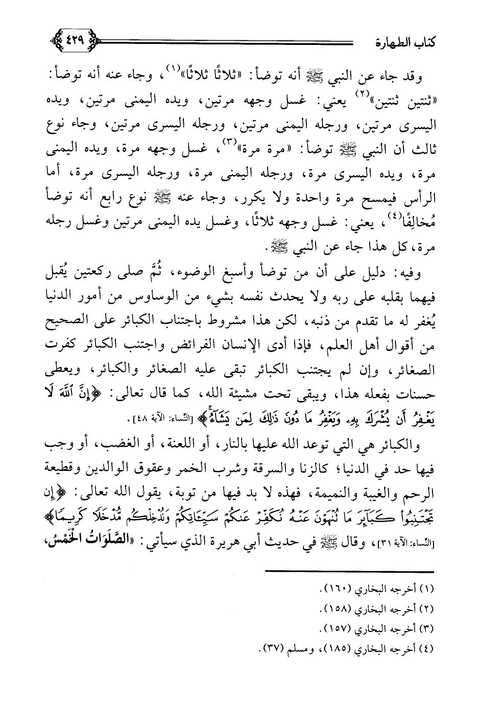 وقد جاء عن النبي صلى الله عليه وسلم أنه توضأ: ثلاثًا ثلاثًا، وجاء عنه أنه توضأ: ثنتين ثنتين، غسل وجهه مرتين، ويده اليمنى مرتين، ويده اليسرى مرتين، ورجله اليمنى مرتين، ورجله اليسرى مرتين، وجاء نوع ثالث أن النبي صلى الله عليه وسلم توضأ: مرة مرة، غسل وجهه مرة، ويده اليمنى مرة، ويده اليسرى مرة، ورجله اليمنى مرة، ورجله اليسرى مرة، أما الرأس فيمسح مرة واحدة ولا يكرر، وجاء عنه صلى الله عليه وسلم نوع رابع أنه توضأ مُخالِفًا، يعني: غسل وجهه ثلاثًا، وغسل يده اليمنى مرتين وغسل رجله مرة، كل هذا جاء عن النبي صلى الله عليه وسلم.
