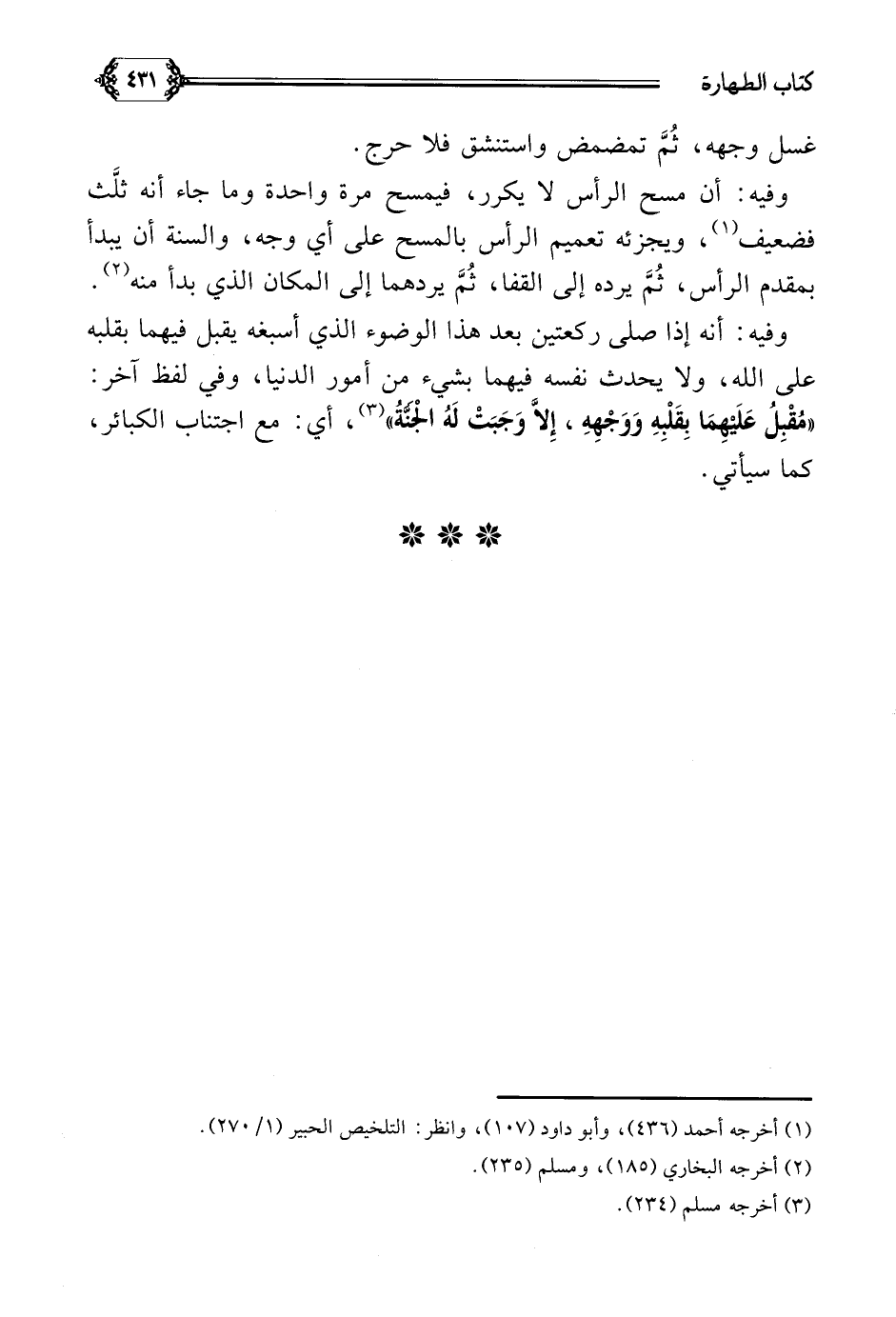 وفيه: أن مسح الرأس لا يكرر، فيمسح مرة واحدة وما جاء أنه ثلَّث فضعيف (¬١)، ويجزئه تعميم الرأس بالمسح على أي وجه، والسنة أن يبدأ بمقدم الرأس، ثُمَّ يرده إلى القفا، ثُمَّ يردهما إلى المكان الذي بدأ منه (¬٢).
