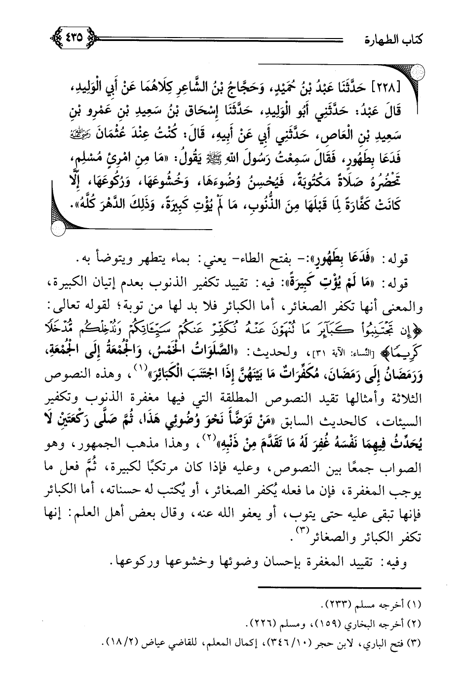 [٢٢٨] حَدَّثَنَا عَبْدُ بْنُ حُمَيْدٍ، وَحَجَّاجُ بْنُ الشَّاعِرِ كِلَاهُمَا عَنْ أَبِي الْوَلِيدِ، قَالَ عَبْدُ، حَدَّثَنِي أَبُو الْوَلِيدِ، حَدَّثَنَا إِسْحَاق بْنُ سَعِيدِ بْنِ عَمْرِو بْنِ سَعِيدِ بْنِ الْعَاصِ، حَدَّثَنِي أَبِي عَنْ أَبِيهِ، قَالَ: كُنْتُ عِنْدَ عُثْمَانَ فَدَعَا بِطَهُورٍ، فَقَالَ سَمِعْتُ رَسُولَ اللَّهِ صلى الله عليه وسلم يَقُولُ: ((مَا مِنِ امْرِئٍ مُسْلِمٍ، تَحْضُرُهُ صَلَاةٌ مَكْتُوبَةٌ، فَيُحْسِنُ وُضُوءَهَا، وَخُشُوعَهَا، وَرُكُوعَهَا، إِلَّا كَانَتْ كَفَّارَةً لِمَا قَبْلَهَا مِنَ الذُّنُوبِ، مَا لَمْ يُؤْتِ كَبِيرَةً، وَذَلِكَ الدَّهْرَ كُلَّهُ)).