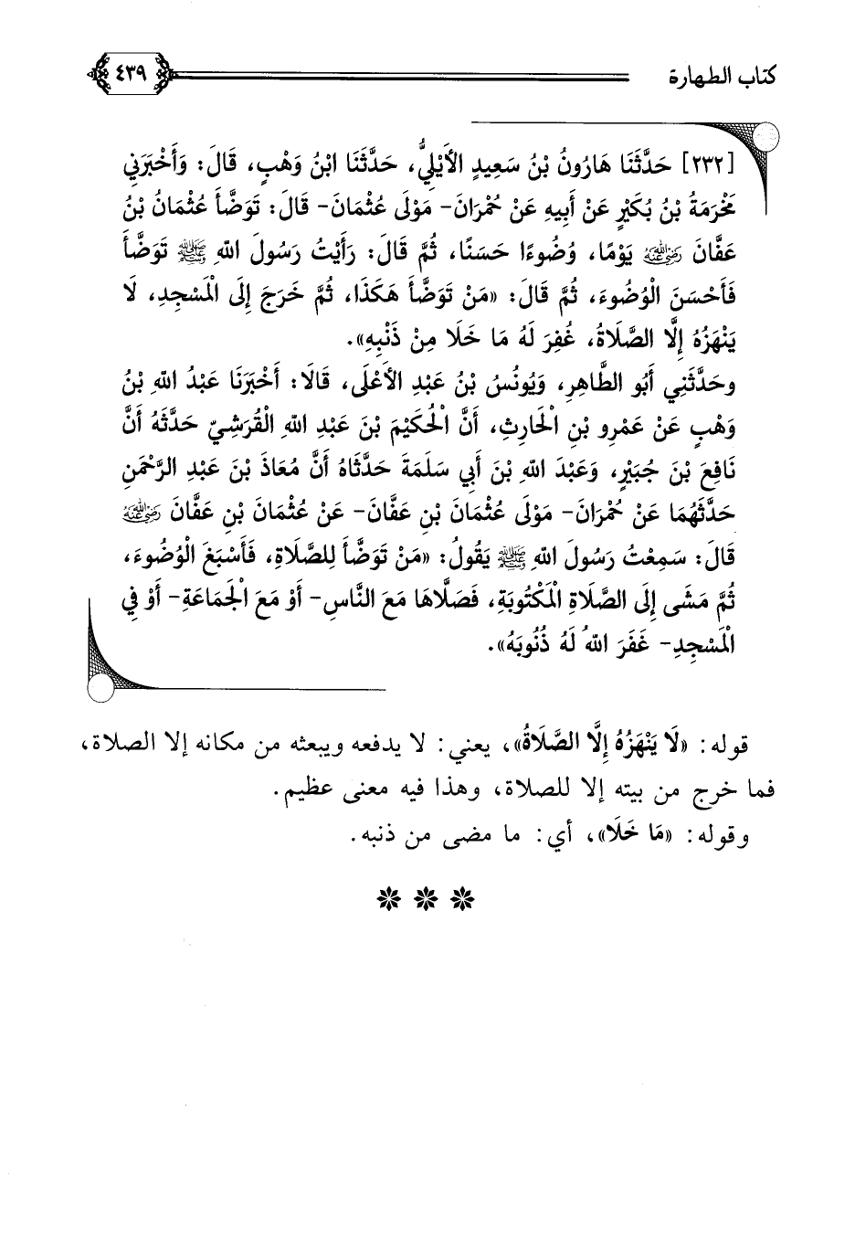 [٢٣٢] حَدَّثَنَا هَارُونُ بْنُ سَعِيدٍ الأَيْلِيُّ، حَدَّثَنَا ابْنُ وَهْبٍ، قَالَ: وَأَخْبَرَنِي مَخْرَمَةُ بْنُ بُكَيْرٍ عَنْ أَبِيهِ عَنْ حُمْرَانَ مَوْلَى عُثْمَانَ، قَالَ: تَوَضَّأَ عُثْمَانُ بْنُ عَفَّانَ يَوْمًا، وُضُوءًا حَسَنًا، ثُمَّ قَالَ: رَأَيْتُ رَسُولَ اللَّهِ صلى الله عليه وسلم تَوَضَّأَ فَأَحْسَنَ الْوُضُوءَ، ثُمَّ قَالَ: ((مَنْ تَوَضَّأَ هَكَذَا، ثُمَّ خَرَجَ إِلَى الْمَسْجِدِ، لَا يَنْهَزُهُ إِلَّا الصَّلَاةُ، غُفِرَ لَهُ مَا خَلَا مِنْ ذَنْبِهِ)).