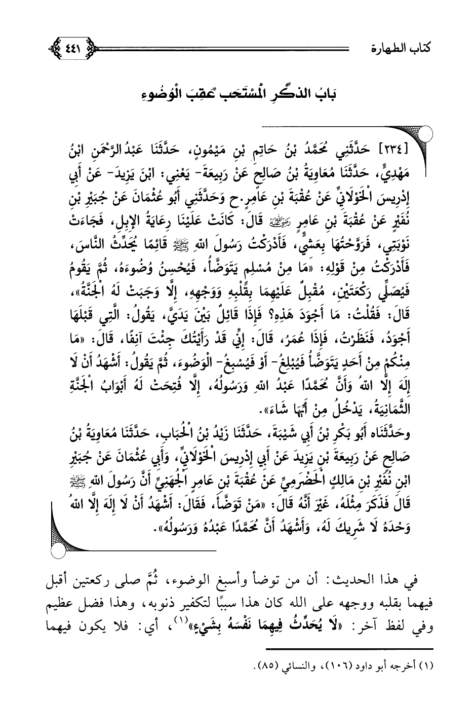 [٢٣٤] حَدَّثَنِي مُحَمَّدُ بْنُ حَاتِمِ بْنِ مَيْمُونٍ، حَدَّثَنَا عَبْدُ الرَّحْمَنِ بْنُ مَهْدِيٍّ، حَدَّثَنَا مُعَاوِيَةُ بْنُ صَالِحٍ عَنْ رَبِيعَةَ يَعْنِي ابْنَ يَزِيدَ عَنْ أَبِي إِدْرِيسَ الْخَوْلَانِيِّ عَنْ عُقْبَةَ بْنِ عَامِرٍ. ح وَحَدَّثَنِي أَبُو عُثْمَانَ عَنْ جُبَيْرِ بْنِ نُفَيْرٍ عَنْ عُقْبَةَ بْنِ عَامِرٍ، قَالَ: كَانَتْ عَلَيْنَا رِعَايَةُ الإِبِلِ، فَجَاءَتْ نَوْبَتِي، فَرَوَّحْتُهَا بِعَشِيٍّ، فَأَدْرَكْتُ رَسُولَ اللَّهِ صلى الله عليه وسلم قَائِمًا يُحَدِّثُ النَّاسَ، فَأَدْرَكْتُ مِنْ قَوْلِهِ: ((مَا مِنْ مُسْلِمٍ يَتَوَضَّأُ، فَيُحْسِنُ وُضُوءَهُ، ثُمَّ يَقُومُ فَيُصَلِّي رَكْعَتَيْنِ، مُقْبِلٌ عَلَيْهِمَا بِقَلْبِهِ وَوَجْهِهِ، إِلَّا وَجَبَتْ لَهُ الْجَنَّةُ))، قَالَ: فَقُلْتُ: مَا أَجْوَدَ هَذِهِ؟ فَإِذَا قَائِلٌ بَيْنَ يَدَيَّ، يَقُولُ: الَّتِي قَبْلَهَا أَجْوَدُ، فَنَظَرْتُ، فَإِذَا عُمَرُ، قَالَ: إِنِّي قَدْ رَأَيْتُكَ جِئْتَ آنِفًا، قَالَ: ((مَا مِنْكُمْ مِنْ أَحَدٍ يَتَوَضَّأُ، فَيُبْلِغُ، أَوْ فَيُسْبِغُ الْوَضُوءَ، ثُمَّ يَقُولُ: أَشْهَدُ أَنْ لَا إِلَهَ إِلَّا اللَّهُ وَأَنَّ مُحَمَّدًا عَبْدُ اللَّهِ وَرَسُولُهُ، إِلَّا فُتِحَتْ لَهُ أَبْوَابُ الْجَنَّةِ الثَّمَانِيَةُ، يَدْخُلُ مِنْ أَيِّهَا شَاءَ)).