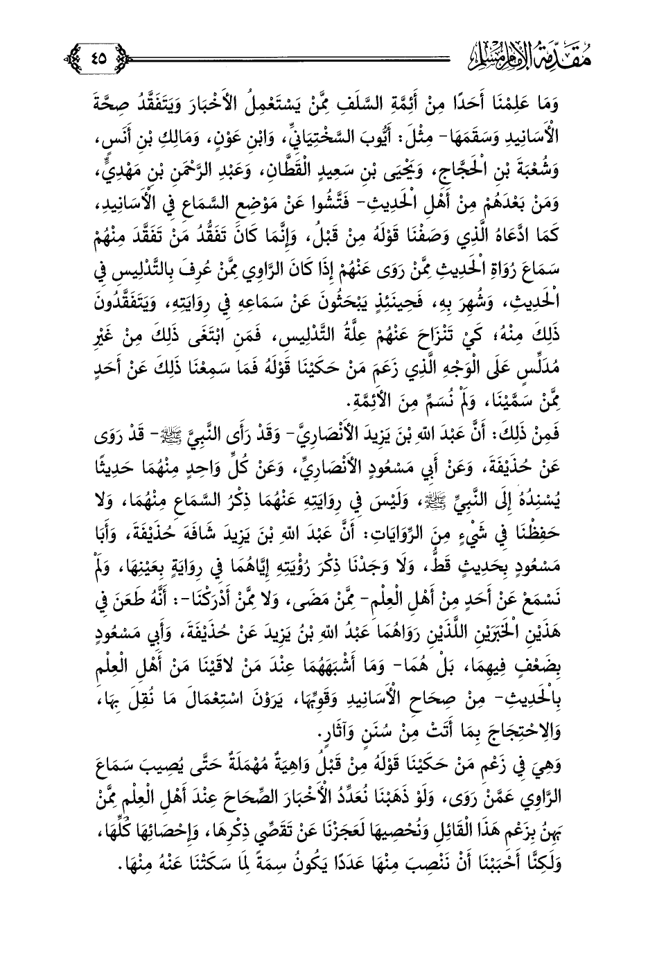 وَمَا عَلِمْنَا أَحَدًا مِنْ أَئِمَّةِ السَّلَفِ مِمَّنْ يَسْتَعْمِلُ الأَخْبَارَ وَيَتَفَقَّدُ صِحَّةَ الْأَسَانِيدِ وَسَقَمَهَا- مِثْلَ: أَيُّوبَ السَّخْتِيَانِيِّ، وَابْنِ عَوْنٍ، وَمَالِكِ بْنِ أَنَسٍ، وَشُعْبَةَ بْنِ الْحَجَّاجِ، وَيَحْيَى بْنِ سَعِيدٍ الْقَطَّانِ، وَعَبْدِ الرَّحْمَنِ بْنِ مَهْدِيٍّ، وَمَنْ بَعْدَهُمْ مِنْ أَهْلِ الْحَدِيثِ- فَتَّشُوا عَنْ مَوْضِعِ السَّمَاعِ فِي الْأَسَانِيدِ، كَمَا ادَّعَاهُ الَّذِي وَصَفْنَا قَوْلَهُ مِنْ قَبْلُ، وَإِنَّمَا كَانَ تَفَقُّدُ مَنْ تَفَقَّدَ مِنْهُمْ سَمَاعَ رُوَاةِ الْحَدِيثِ مِمَّنْ رَوَى عَنْهُمْ إِذَا كَانَ الرَّاوِي مِمَّنْ عُرِفَ بِالتَّدْلِيسِ فِي الْحَدِيثِ، وَشُهِرَ بِهِ، فَحِينَئِذٍ يَبْحَثُونَ عَنْ سَمَاعِهِ فِي رِوَايَتِهِ، وَيَتَفَقَّدُونَ ذَلِكَ مِنْهُ؛ كَيْ تَنْزَاحَ عَنْهُمْ عِلَّةُ التَّدْلِيسِ، فَمَنْ ابْتَغَى ذَلِكَ مِنْ غَيْرِ مُدَلِّسٍ عَلَى الْوَجْهِ الَّذِي زَعَمَ مَنْ حَكَيْنَا قَوْلَهُ فَمَا سَمِعْنَا ذَلِكَ عَنْ أَحَدٍ مِمَّنْ سَمَّيْنَا، وَلَمْ نُسَمِّ مِنْ الأَئِمَّةِ.