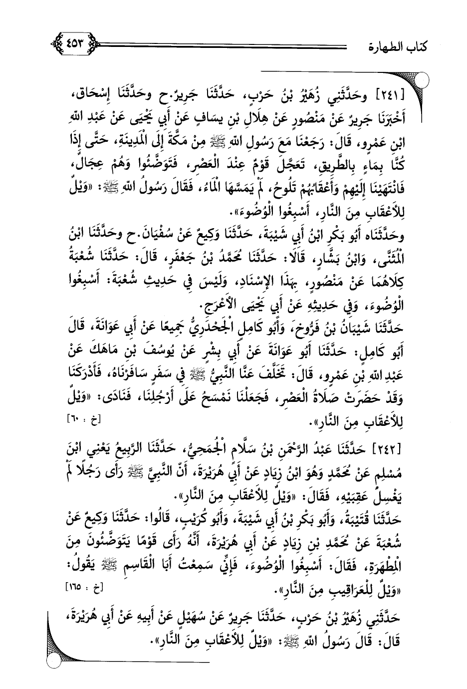 حَدَّثَنِي زُهَيْرُ بْنُ حَرْبٍ، حَدَّثَنَا جَرِيرٌ عَنْ سُهَيْلٍ عَنْ أَبِيهِ عَنْ أَبِي هُرَيْرَةَ، قَالَ: قَالَ رَسُولُ اللَّهِ صلى الله عليه وسلم: ((وَيْلٌ لِلأَعْقَابِ مِنَ النَّارِ)).