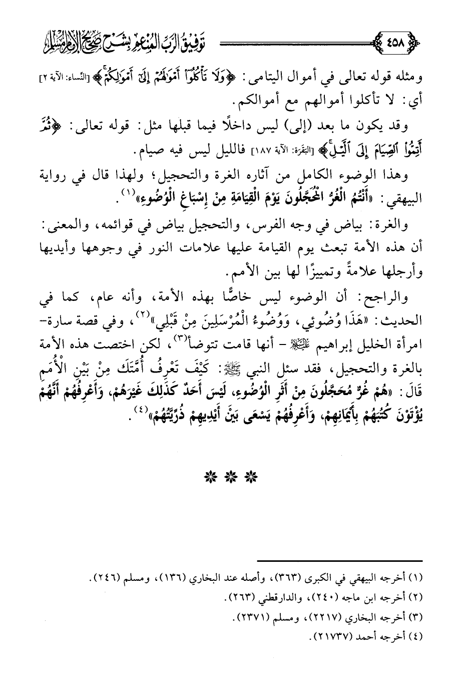 ومثله قوله تعالى في أموال اليتامى: {ولا تأكلوا أموالهم إلى أموالكم} أي: لا تأكلوا أموالهم مع أموالكم، وقد يكون ما بعد (إلى) ليس داخلًا فيما قبلها مثل: قوله تعالى: {ثم أتموا الصيام إلى الليل} فالليل ليس فيه صيام.