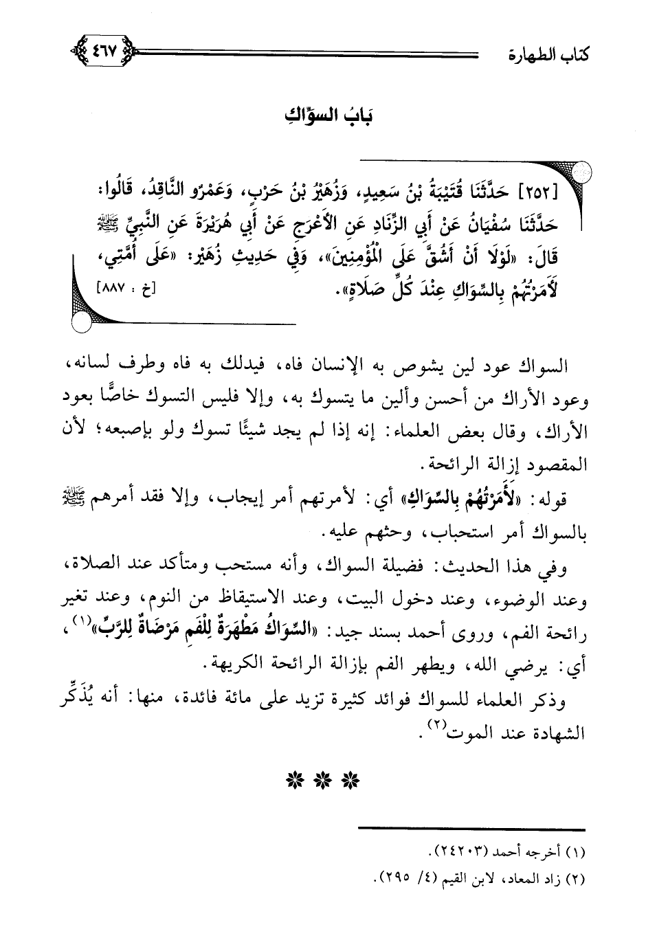 (٣٧٥) -[٢٥٤] حَدَّثَنَا قُتَيْبَةُ بْنُ سَعِيدٍ، وَزُهَيْرُ بْنُ حَرْبٍ، وَعَمْرٌو النَّاقِدُ، قَالُوا: حَدَّثَنَا سُفْيَانُ عَنْ أَبِي الزِّنَادِ عَنِ الأَعْرَجِ عَنْ أَبِي هُرَيْرَةَ عَنِ النَّبِيِّ صلى الله عليه وسلم قَالَ: ((لَوْلَا أَنْ أَشُقَّ عَلَى الْمُؤْمِنِينَ))، وَفِي حَدِيثِ زُهَيْر: ((عَلَى أُمَّتِي، لَأَمَرْتُهُمْ بِالسِّوَاكِ عِنْدَ كُلِّ صَلَاةٍ)).