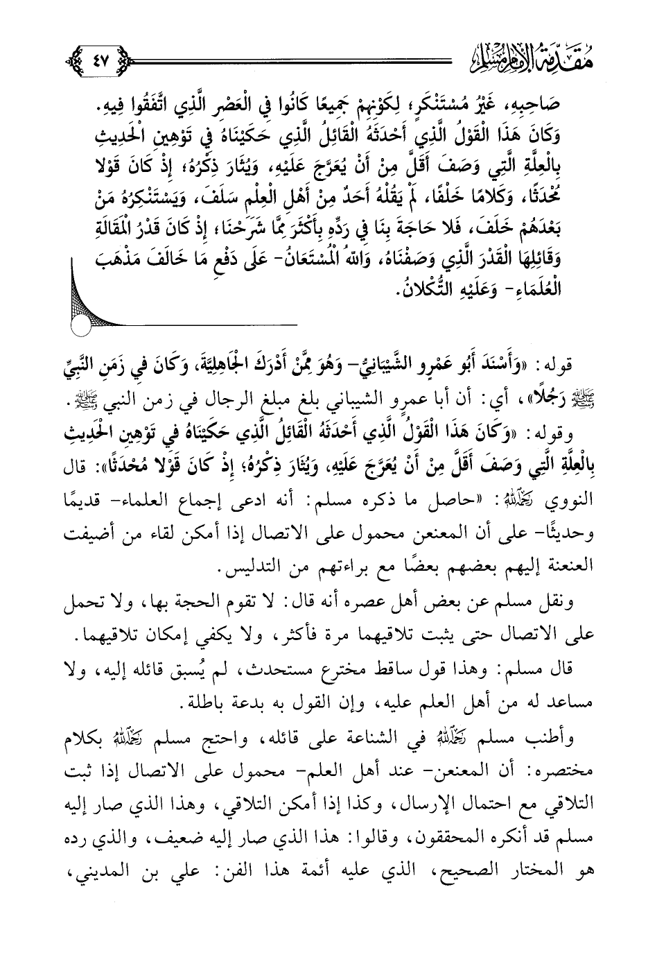 وقوله: ((وَكَانَ هَذَا الْقَوْلُ الَّذِي أَحْدَثَهُ الْقَائِلُ الَّذِي حَكَيْنَاهُ فِي تَوْهِينِ الْحَدِيثِ بِالْعِلَّةِ الَّتِي وَصَفَ أَقَلَّ مِنْ أَنْ يُعَرَّجَ عَلَيْهِ، وَيُثَارَ ذِكْرُهُ؛ إِذْ كَانَ قَوْلا مُحْدَثًا)) : قال النووي رحمه الله: ((حاصل ما ذكره مسلم: أنه ادعى إجماع العلماء- قديمًا وحديثًا- على أن المعنعن محمول على الاتصال إذا أمكن لقاء من أضيفت العنعنة إليهم بعضهم بعضًا مع براءتهم من التدليس.