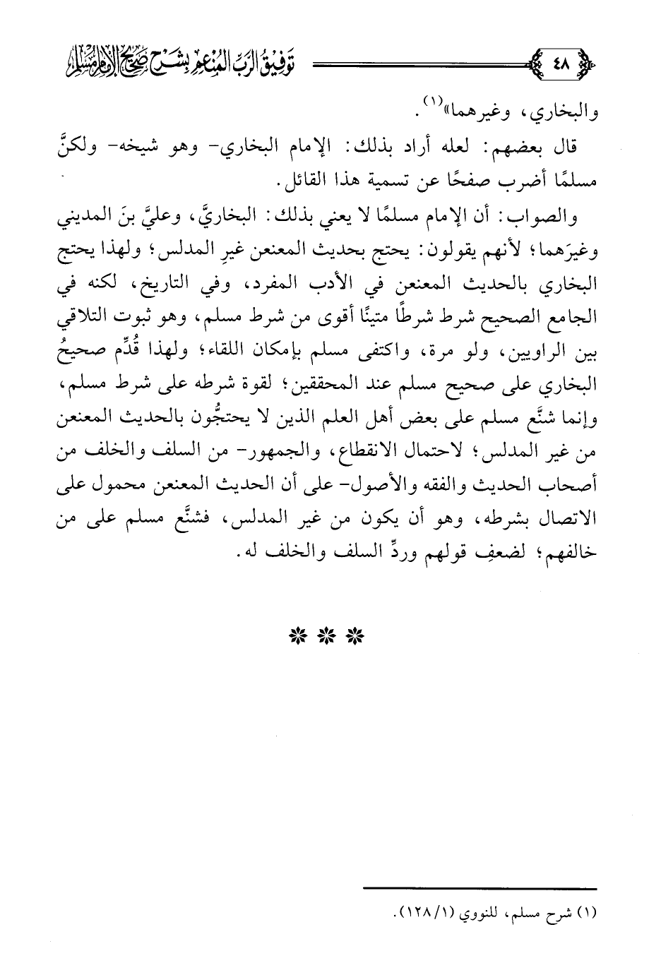 والصواب: أن الإمام مسلمًا لا يعني بذلك البخاريَّ، وعليَّ بنَ المديني وغيرَهما؛ لأنهم يقولون: يحتج بحديث المعنعن غيرِ المدلس؛ ولهذا يحتج البخاري بالحديث المعنعن في الأدب المفرد، وفي التاريخ، لكنه في الجامع الصحيح شرط شرطًا متينًا أقوى من شرط مسلم، وهو ثبوت التلاقي بين الراويين، ولو مرة، واكتفى مسلم بإمكان اللقاء؛ ولهذا قُدِّم صحيحُ البخاري على صحيح مسلم عند المحققين؛ لقوة شرطه على شرط مسلم؛ وإنما شنَّع مسلم على بعض أهل العلم الذين لا يحتجُّون بالحديث المعنعن من غير المدلس؛ لاحتمال الانقطاع، والجمهور- من السلف والخلف من أصحاب الحديث والفقه والأصول- على أن الحديث المعنعن محمول على الاتصال بشرطه، وهو أن يكون من غير المدلس، فشنَّع مسلم على من خالفهم؛ لضعفِ قولهم وردِّ السلف والخلف له.