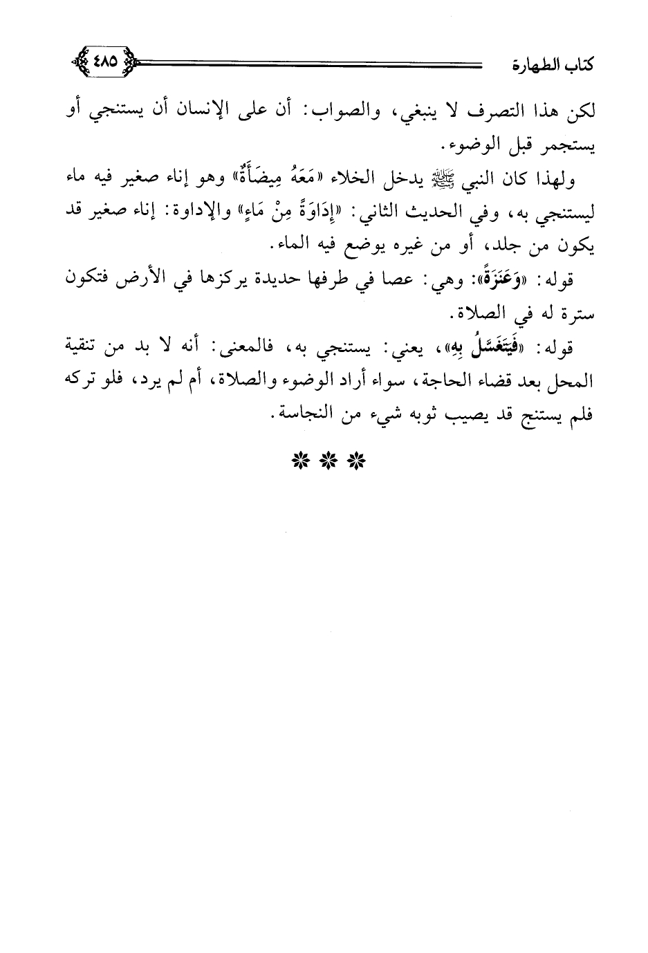 ولهذا كان النبي صلى الله عليه وسلم يدخل الخلاء ((مَعَهُ مِيضَأَةٌ)) وهو إناء صغير فيه ماء ليستنجي به، وفي الحديث الثاني: ((إِدَاوَةً مِنْ مَاءٍ)) والإداوة: إناء صغير قد يكون من جلد، أو من غيره يوضع فيه الماء.