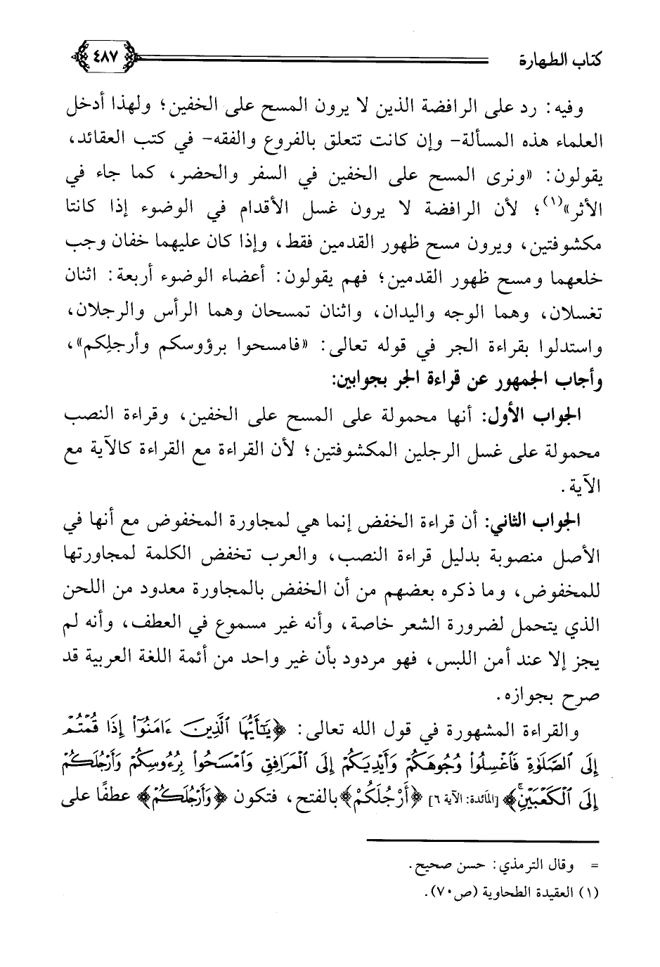 وفي الحديث رد على الرافضة الذين لا يرون المسح على الخفين؛ ولهذا أدخل العلماء هذه المسألة- وإن كانت تتعلق بالفروع والفقه- في كتب العقائد، يقولون: ((ونرى المسح على الخفين في السفر والحضر، كما جاء في الأثر)) (¬١)؛ لأن الرافضة لا يرون غسل الأقدام في الوضوء إذا كانتا مكشوفتين، ويرون مسح ظهور القدمين فقط، وإذا كان عليهما خفان وجب خلعهما ومسح ظهور القدمين؛ فهم يقولون: أعضاء الوضوء أربعة: اثنان تغسلان، وهما الوجه واليدان، واثنان تمسحان وهما الرأس والرجلان، واستدلوا بقراءة الجر في قوله تعالى: ((فامسحوا برؤوسكم وأرجلِكم)) وأجاب الجمهور عَنْ قراءة الجر بجوابين: