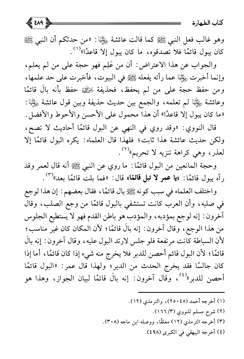 والجواب عن هذا الاعتراض: أن من عَلِم فهو حجة على من لم يعلم، وإنما أخبرت رضي الله عنها عما رأته يفعله صلى الله عليه وسلم في البيوت، فأخبرت على حد علمها، ومن حفظ حجة على من لم يحفظ، فحذيفة حفظ بأنه بالَ قائمًا وعائشة لم تعلمه، والجمع بين حديث حذيفة وبين قول عائشة: ((ما كان يبول إلا قاعدًا)) أن هذا محمول على الأحسن والأحوط والأفضل.