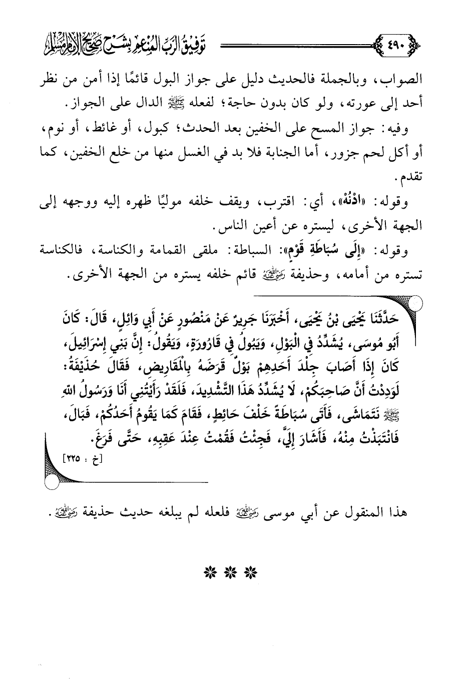 حَدَّثَنَا يَحْيَى بْنُ يَحْيَى، أَخْبَرَنَا جَرِيرٌ عَنْ مَنْصُورٍ عَنْ أَبِي وَائِلٍ، قَالَ: كَانَ أَبُو مُوسَى، يُشَدِّدُ فِي الْبَوْلِ، وَيَبُولُ فِي قَارُورَةٍ، وَيَقُولُ: إِنَّ بَنِي إِسْرَائِيلَ، كَانَ إِذَا أَصَابَ جِلْدَ أَحَدِهِمْ بَوْلٌ، قَرَضَهُ بِالْمَقَارِيضِ، فَقَالَ حُذَيْفَةُ: لَوَدِدْتُ أَنَّ صَاحِبَكُمْ، لَا يُشَدِّدُ هَذَا التَّشْدِيدَ، فَلَقَدْ رَأَيْتُنِي أَنَا وَرَسُولُ اللَّهِ صلى الله عليه وسلم نَتَمَاشَى، فَأَتَى سُبَاطَةً خَلْفَ حَائِطٍ، فَقَامَ كَمَا يَقُومُ أَحَدُكُمْ، فَبَالَ، فَانْتَبَذْتُ مِنْهُ، فَأَشَارَ إِلَيَّ، فَجِئْتُ فَقُمْتُ عِنْدَ عَقِبِهِ، حَتَّى فَرَغَ.