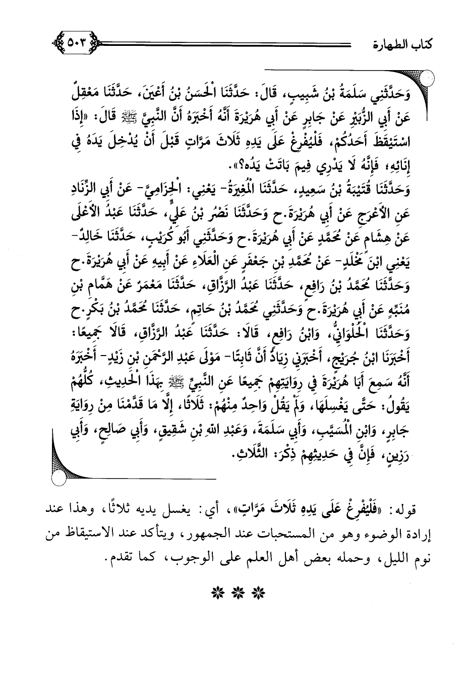 وحَدَّثَنَا قُتَيْبَةُ بْنُ سَعِيدٍ، حَدَّثَنَا الْمُغِيرَةُ يَعْنِي الْحِزَامِيَّ عَنْ أَبِي الزِّنَادِ عَنِ الأَعْرَجِ عَنْ أَبِي هُرَيْرَةَ. ح وحَدَّثَنَا نَصْرُ بْنُ عَلِيٍّ، حَدَّثَنَا عَبْدُ الأَعْلَى عَنْ هِشَامٍ عَنْ مُحَمَّدٍ عَنْ أَبِي هُرَيْرَةَ. ح وحَدَّثَنِي أَبُو كُرَيْبٍ، حَدَّثَنَا خَالِدٌ يَعْنِي ابْنَ مَخْلَدٍ عَنْ مُحَمَّدِ بْنِ جَعْفَرٍ عَنِ الْعَلَاءِ عَنْ أَبِيهِ عَنْ أَبِي هُرَيْرَةَ. ح وحَدَّثَنَا مُحَمَّدُ بْنُ رَافِعٍ، حَدَّثَنَا عَبْدُ الرَّزَّاقِ، حَدَّثَنَا مَعْمَرٌ عَنْ هَمَّامِ بْنِ مُنَبِّهٍ عَنْ أَبِي هُرَيْرَةَ. ح وحَدَّثَنِي مُحَمَّدُ بْنُ حَاتِمٍ، حَدَّثَنَا مُحَمَّدُ بْنُ بَكْرٍ. ح وحَدَّثَنَا الْحُلْوَانِيُّ، وَابْنُ رَافِعٍ، قَالَا: حَدَّثَنَا عَبْدُ الرَّزَّاقِ، قَالَا جَمِيعًا: أَخْبَرَنَا ابْنُ جُرَيْجٍ، أَخْبَرَنِي زِيَادٌ، أَنَّ ثَابِتًا مَوْلَى عَبْدِ الرَّحْمَنِ بْنِ زَيْدٍ أَخْبَرَهُ، أَنَّهُ سَمِعَ أَبَا هُرَيْرَةَ فِي رِوَايَتِهِمْ جَمِيعًا عَنِ النَّبِيِّ صلى الله عليه وسلم بِهَذَا الْحَدِيثِ، كُلُّهُمْ يَقُولُ: حَتَّى يَغْسِلَهَا، وَلَمْ يَقُلْ وَاحِدٌ مِنْهُمْ: ثَلَاثًا، إِلَّا مَا قَدَّمْنَا مِنْ رِوَايَةِ جَابِرٍ، وَابْنِ الْمُسَيَّبِ، وَأَبِي سَلَمَةَ، وَعَبْدِ اللَّهِ بْنِ شَقِيقٍ، وَأَبِي صَالِحٍ، وَأَبِي رَزِينٍ، فَإِنَّ فِي حَدِيثِهِمْ ذِكْرَ: الثَّلَاثِ.