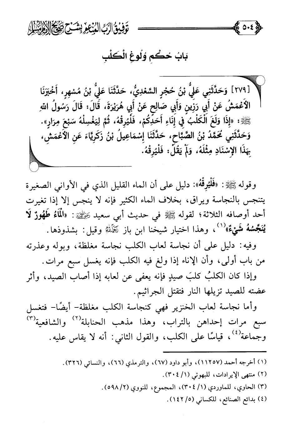 [٢٧٩] وحَدَّثَنِي عَلِيُّ بْنُ حُجْرٍ السَّعْدِيُّ، حَدَّثَنَا عَلِيُّ بْنُ مُسْهِرٍ، أَخْبَرَنَا الأَعْمَشُ عَنْ أَبِي رَزِينٍ وَأَبِي صَالِحٍ عَنْ أَبِي هُرَيْرَةَ، قَالَ: قَالَ رَسُولُ اللَّهِ صلى الله عليه وسلم: ((إِذَا وَلَغَ الْكَلْبُ فِي إِنَاءِ أَحَدِكُمْ، فَلْيُرِقْهُ، ثُمَّ لِيَغْسِلْهُ سَبْعَ مِرَارٍ)).