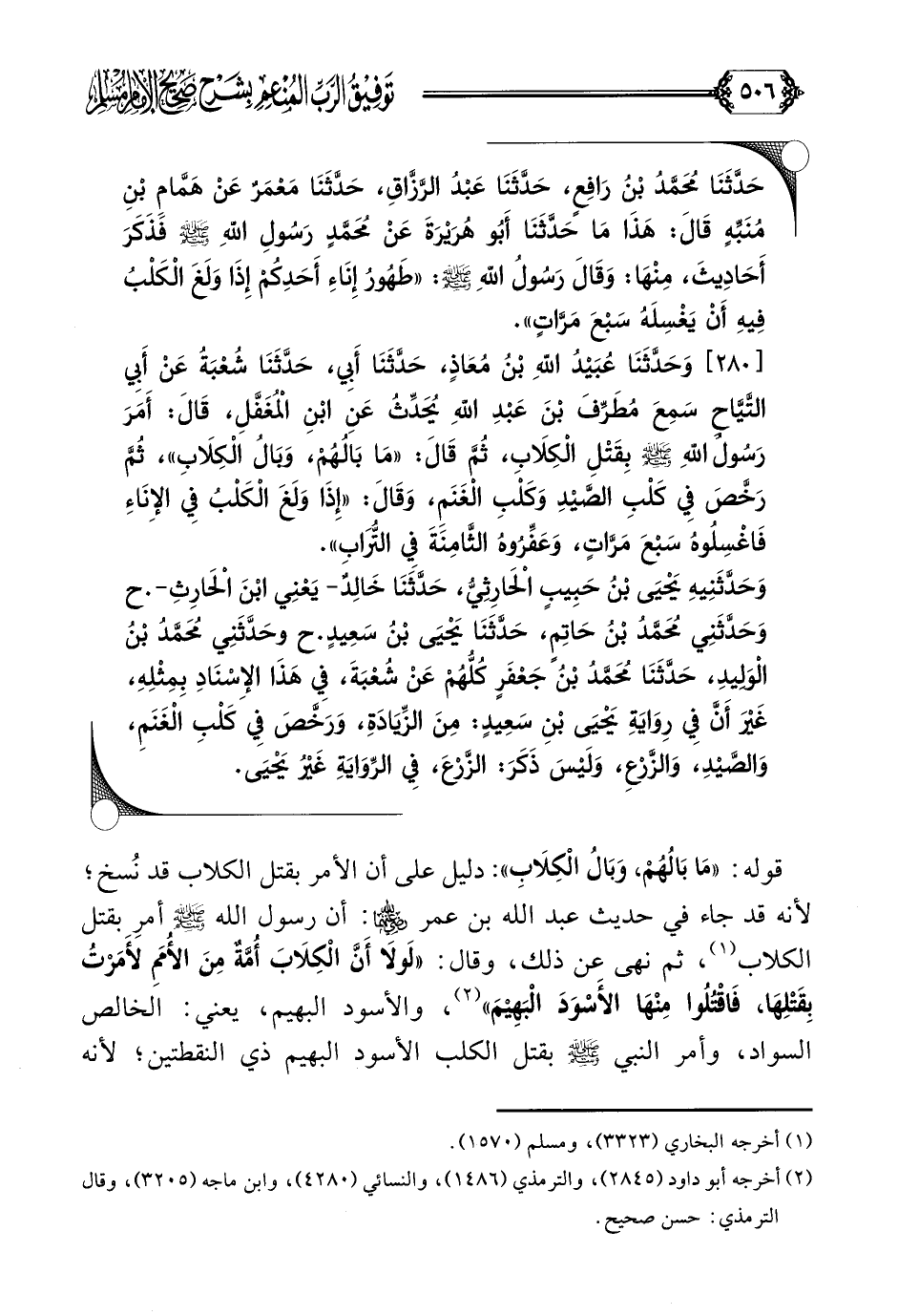 [٢٨٠] وحَدَّثَنَا عُبَيْدُ اللَّهِ بْنُ مُعَاذٍ، حَدَّثَنَا أَبِي، حَدَّثَنَا شُعْبَةُ عَنْ أَبِي التَّيَّاحِ سَمِعَ مُطَرِّفَ بْنَ عَبْدِ اللَّهِ يُحَدِّثُ عَنِ ابْنِ الْمُغَفَّلِ، قَالَ: أَمَرَ رَسُولُ اللَّهِ صلى الله عليه وسلم بِقَتْلِ الْكِلَابِ، ثُمَّ قَالَ: ((مَا بَالُهُمْ، وَبَالُ الْكِلَابِ))، ثُمَّ رَخَّصَ فِي كَلْبِ الصَّيْدِ وَكَلْبِ الْغَنَمِ، وَقَالَ: ((إِذَا وَلَغَ الْكَلْبُ فِي الإِنَاءِ، فَاغْسِلُوهُ سَبْعَ مَرَّاتٍ، وَعَفِّرُوهُ الثَّامِنَةَ فِي التُّرَابِ)).