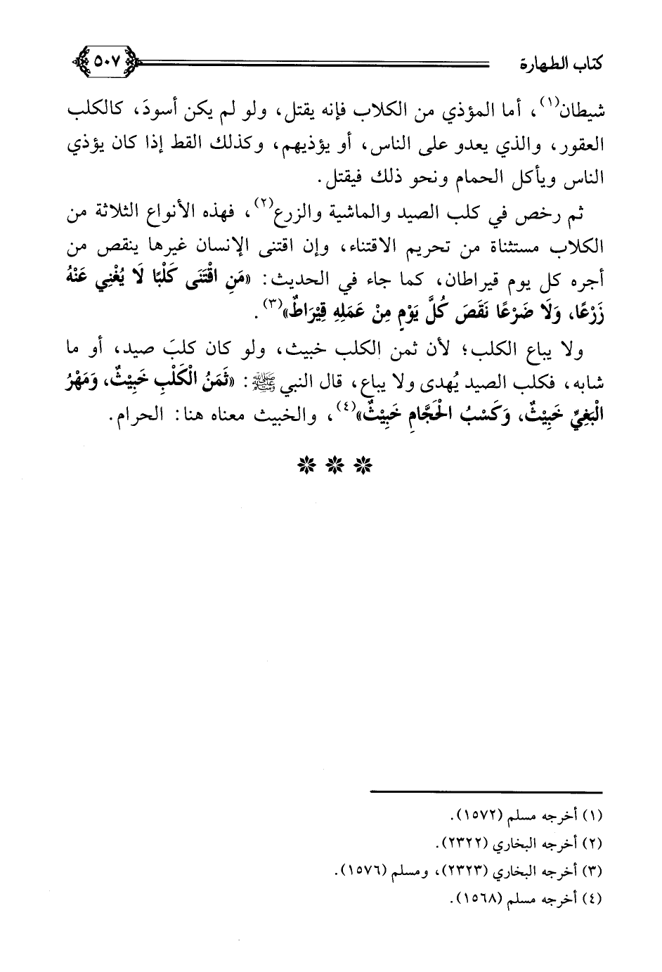 ولا يباع الكلب؛ لأن ثمن الكلب خبيث، ولو كان كلبَ صيد أو ما شابه، فكلب الصيد يُهدى ولا يباع، قال النبي صلى الله عليه وسلم: ((ثمن الكلب خبيث، ومهر البغي خبيث، وكسب الحجام خبيث)) (¬٤)، والخبيث معناه هنا: الحرام.