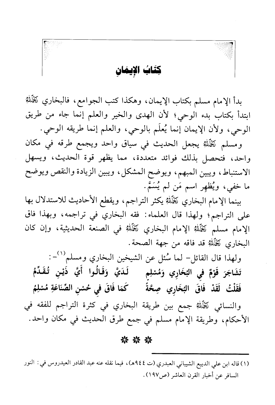 بدأ الإمام مسلم بكتاب الإيمان، وهكذا كتب الجوامع، فالبخاري رحمه الله ابتدأ بكتاب بدء الوحي؛ لأن الهدى والخير والعلم إنما جاء من طريق الوحي، ولأن الإيمان إنما يُعلَم بالوحي، والعلم إنما طريقه الوحي.