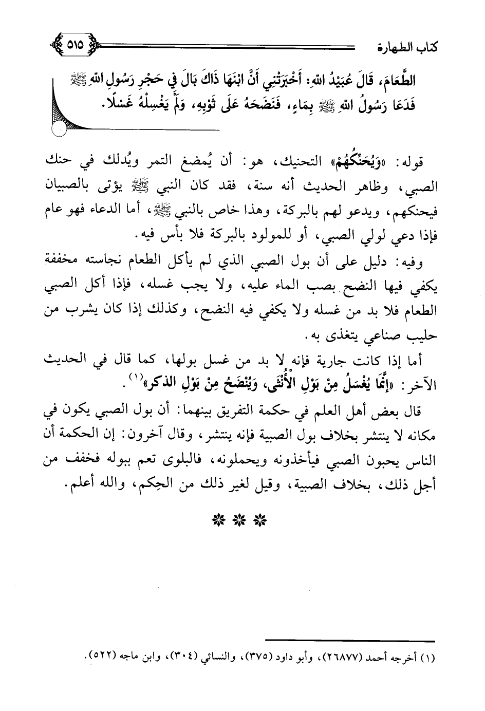 الطَّعَامَ، قَالَ عُبَيْدُ اللَّهِ: أَخْبَرَتْنِي أَنَّ ابْنَهَا ذَاكَ، بَالَ فِي حَجْرِ رَسُولِ اللَّهِ صلى الله عليه وسلم فَدَعَا رَسُولُ اللَّهِ صلى الله عليه وسلم بِمَاءٍ، فَنَضَحَهُ عَلَى ثَوْبِهِ، وَلَمْ يَغْسِلْهُ غَسْلًا.