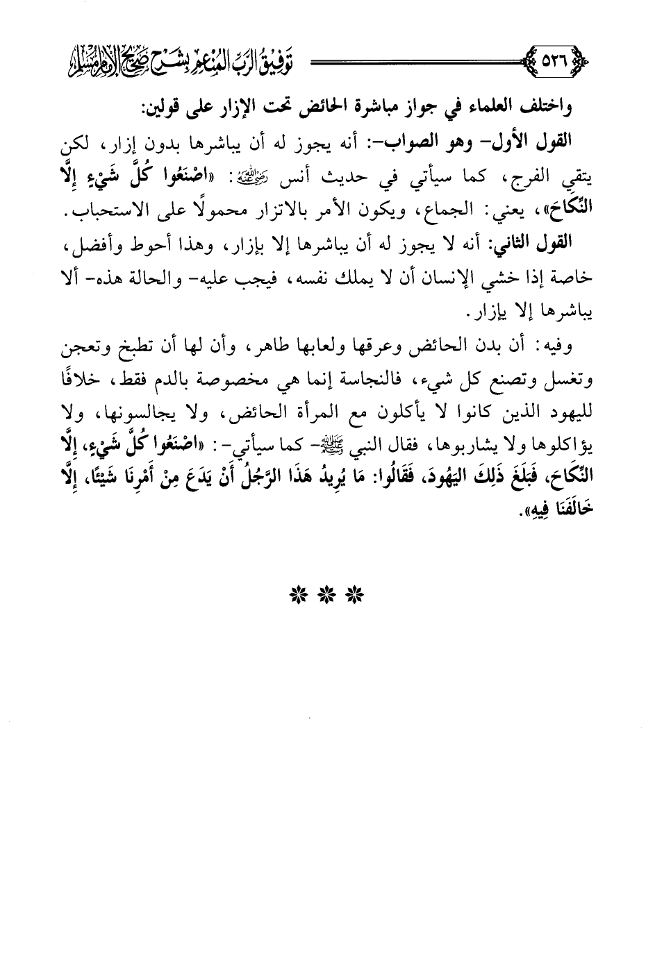 القول الثاني: أنه لا يجوز له أن يباشرها إلا بإزار، وهذا أحوط وأفضل، خاصة إذا خشى الإنسان أن لا يملك نفسه، فيجب عليه والحالة هذه ألا يباشرها إلا يإزار.