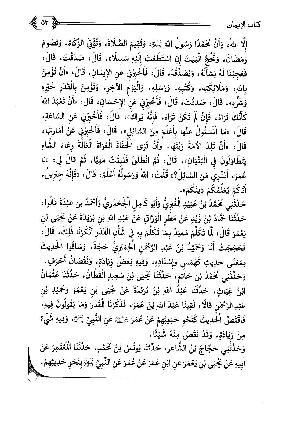 إِلَّا اللَّهُ، وَأَنَّ مُحَمَّدًا رَسُولُ اللَّهِ صلى الله عليه وسلم، وَتُقِيمَ الصَّلَاةَ، وَتُؤْتِيَ الزَّكَاةَ، وَتَصُومَ رَمَضَانَ، وَتَحُجَّ الْبَيْتَ إِنِ اسْتَطَعْتَ إِلَيْهِ سَبِيلًا))، قَالَ: صَدَقْتَ، قَالَ: فَعَجِبْنَا لَهُ يَسْأَلُهُ، وَيُصَدِّقُهُ، قَالَ: فَأَخْبِرْنِي عَنِ الإِيمَانِ، قَالَ: ((أَنْ تُؤْمِنَ بِاللَّهِ، وَمَلَائِكَتِهِ، وَكُتُبِهِ، وَرُسُلِهِ، وَالْيَوْمِ الآخِرِ، وَتُؤْمِنَ بِالْقَدَرِ خَيْرِهِ وَشَرِّهِ))، قَالَ: صَدَقْتَ، قَالَ: فَأَخْبِرْنِي عَنِ الإِحْسَانِ، قَالَ: ((أَنْ تَعْبُدَ اللَّهَ كَأَنَّكَ تَرَاهُ، فَإِنْ لَمْ تَكُنْ تَرَاهُ، فَإِنَّهُ يَرَاكَ))، قَالَ: فَأَخْبِرْنِي عَنِ السَّاعَةِ، قَالَ: ((مَا الْمَسْئُولُ عَنْهَا بِأَعْلَمَ مِنَ السَّائِلِ))، قَالَ: فَأَخْبِرْنِي عَنْ أَمَارَتِهَا، قَالَ: ((أَنْ تَلِدَ الأَمَةُ رَبَّتَهَا، وَأَنْ تَرَى الْحُفَاةَ الْعُرَاةَ الْعَالَةَ رِعَاءَ الشَّاءِ يَتَطَاوَلُونَ فِي الْبُنْيَانِ))، قَالَ: ثُمَّ انْطَلَقَ فَلَبِثْتُ مَلِيًّا، ثُمَّ قَالَ لِي: ((يَا عُمَرُ، أَتَدْرِي مَنِ السَّائِلُ؟ )) قُلْتُ: اللَّهُ وَرَسُولُهُ أَعْلَمُ، قَالَ: ((فَإِنَّهُ جِبْرِيلُ، أَتَاكُمْ يُعَلِّمُكُمْ دِينَكُمْ)).
