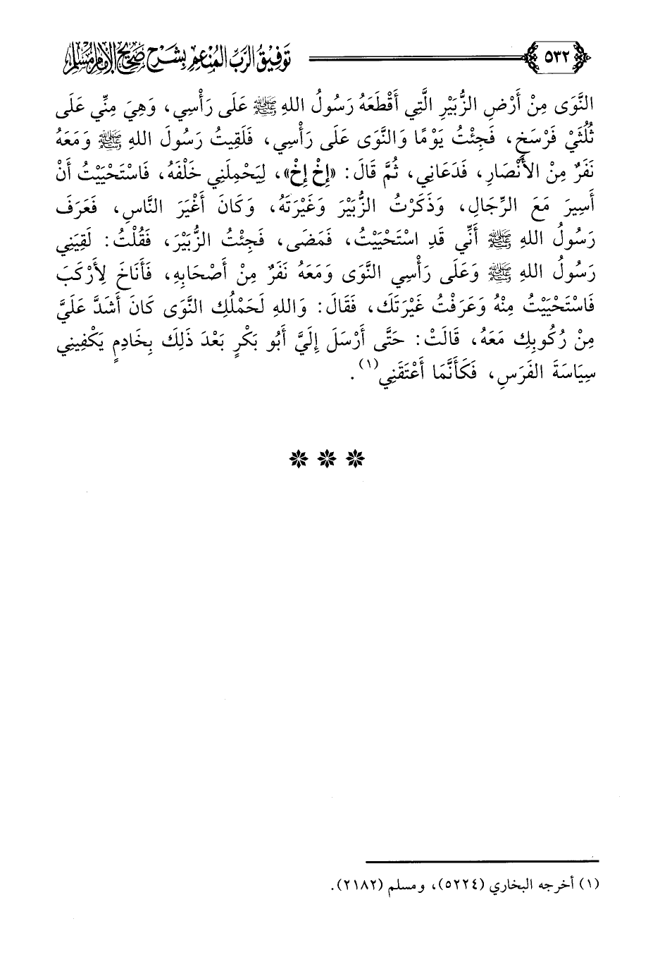 النَّوَى مِنْ أَرْضِ الزُّبَيْرِ الَّتِي أَقْطَعَهُ رَسُولُ اللَّهِ صلى الله عليه وسلم عَلَى رَأْسِي، وَهِيَ مِنِّي عَلَى ثُلُثَيْ فَرْسَخٍ، فَجِئْتُ يَوْمًا وَالنَّوَى عَلَى رَأْسِي، فَلَقِيتُ رَسُولَ اللَّهِ صلى الله عليه وسلم وَمَعَهُ نَفَرٌ مِنْ الأَنْصَارِ، فَدَعَانِي، ثُمَّ قَالَ: ((إِخْ إِخْ))، لِيَحْمِلَنِي خَلْفَهُ، فَاسْتَحْيَيْتُ أَنْ أَسِيرَ مَعَ الرِّجَالِ، وَذَكَرْتُ الزُّبَيْرَ وَغَيْرَتَهُ، وَكَانَ أَغْيَرَ النَّاسِ، فَعَرَفَ رَسُولُ اللَّهِ صلى الله عليه وسلم أَنِّي قَدِ اسْتَحْيَيْتُ، فَمَضَى، فَجِئْتُ الزُّبَيْرَ، فَقُلْتُ: لَقِيَنِي رَسُولُ اللَّهِ صلى الله عليه وسلم وَعَلَى رَأْسِي النَّوَى وَمَعَهُ نَفَرٌ مِنْ أَصْحَابِهِ، فَأَنَاخَ لِأَرْكَبَ فَاسْتَحْيَيْتُ مِنْهُ وَعَرَفْتُ غَيْرَتَكَ، فَقَالَ: وَاللَّهِ لَحَمْلُكِ النَّوَى كَانَ أَشَدَّ عَلَيَّ مِنْ رُكُوبِكِ مَعَهُ، قَالَتْ: حَتَّى أَرْسَلَ إِلَيَّ أَبُو بَكْرٍ بَعْدَ ذَلِكَ بِخَادِمٍ يَكْفِينِي سِيَاسَةَ الفَرَسِ، فَكَأَنَّمَا أَعْتَقَنِي (¬١).