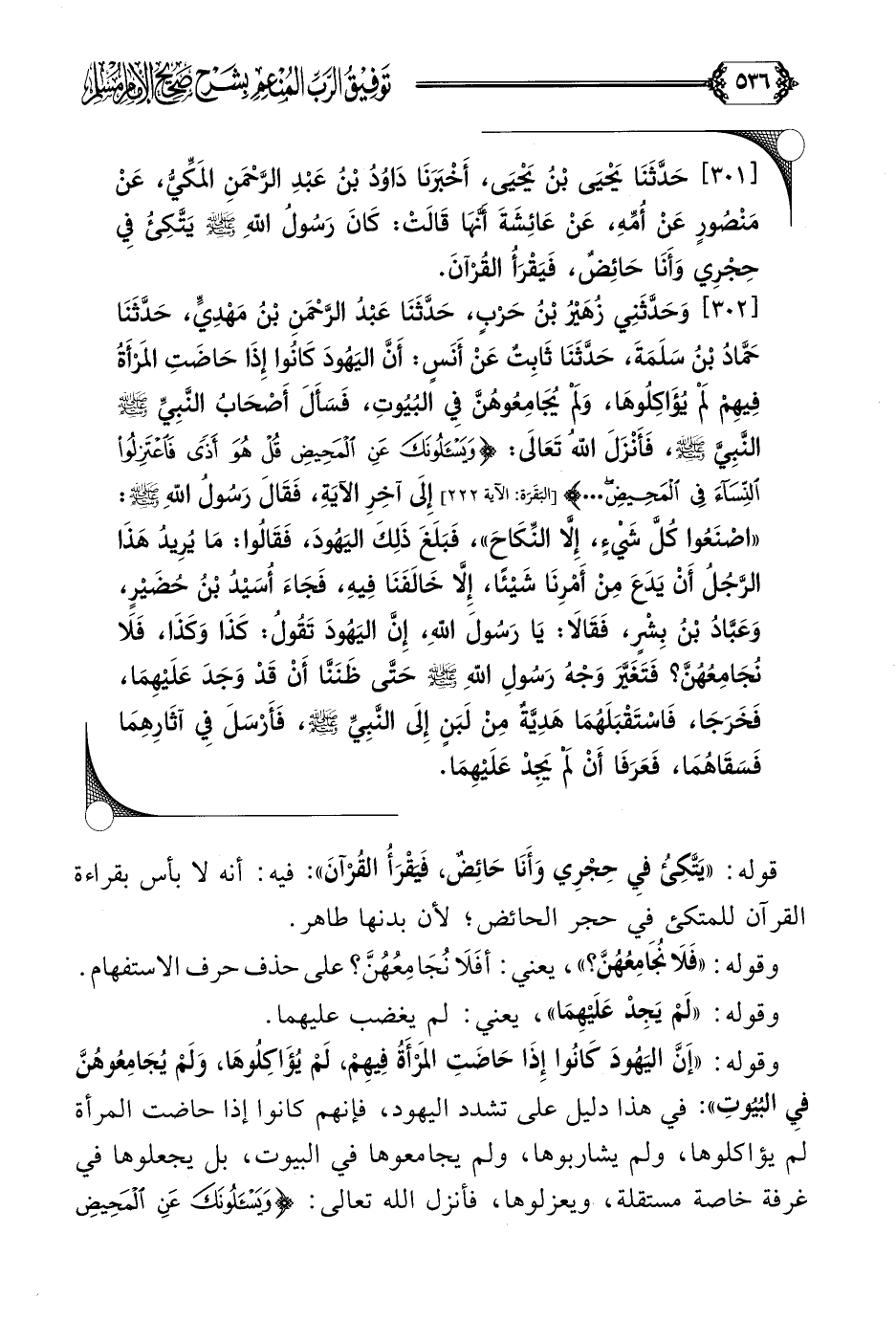 [٣٠١] حَدَّثَنَا يَحْيَى بْنُ يَحْيَى، أَخْبَرَنَا دَاوُدُ بْنُ عَبْدِ الرَّحْمَنِ المَكِّيُّ، عَنْ مَنْصُورٍ عَنْ أُمِّهِ، عَنْ عَائِشَةَ أَنَّهَا قَالَتْ: كَانَ رَسُولُ اللَّهِ صلى الله عليه وسلم يَتَّكِئُ فِي حِجْرِي وَأَنَا حَائِضٌ، فَيَقْرَأُ القُرْآنَ.