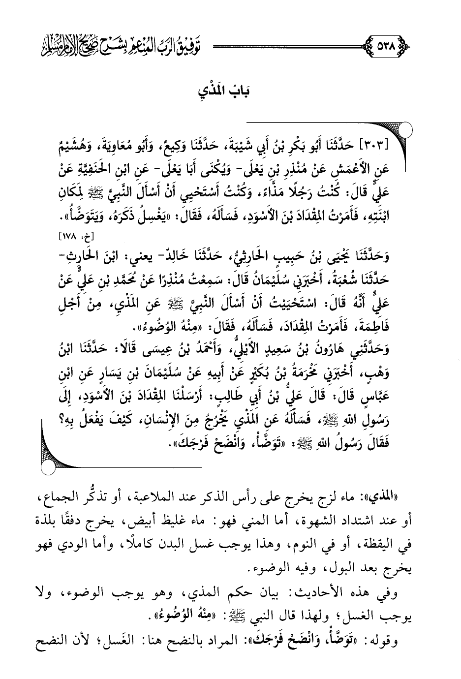 [٣٠٣] حَدَّثَنَا أَبُو بَكْرِ بْنُ أَبِي شَيْبَةَ، حَدَّثَنَا وَكِيعٌ، وَأَبُو مُعَاوِيَةَ، وَهُشَيْمٌ عَنِ الأَعْمَشِ عَنْ مُنْذِرِ بْنِ يَعْلَى- وَيُكْنَى أَبَا يَعْلَى- عَنِ ابْنِ الحَنَفِيَّةِ عَنْ عَلِيٍّ قَالَ: كُنْتُ رَجُلًا مَذَّاءً، وَكُنْتُ أَسْتَحْيِي أَنْ أَسْأَلَ النَّبِيَّ صلى الله عليه وسلم لِمَكَانِ ابْنَتِهِ، فَأَمَرْتُ المِقْدَادَ بْنَ الأَسْوَدِ، فَسَأَلَهُ، فَقَالَ: ((يَغْسِلُ ذَكَرَهُ، وَيَتَوَضَّأُ)).