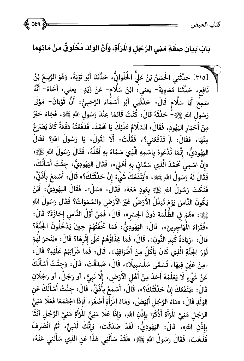 [٣١٥] حَدَّثَنِي الحَسَنُ بْنُ عَلِيٍّ الحُلْوَانِيُّ، حَدَّثَنَا أَبُو تَوْبَةَ، وَهُوَ الرَّبِيعُ بْنُ نَافِعٍ، حَدَّثَنَا مُعَاوِيَةُ- يعني: ابْنَ سَلَّامٍ- عَنْ زَيْدٍ- يعني: أَخَاهُ- أَنَّهُ سَمِعَ أَبَا سَلَّامٍ قَالَ: حَدَّثَنِي أَبُو أَسْمَاءَ الرَّحَبِيُّ: أَنَّ ثَوْبَانَ- مَوْلَى رَسُولِ اللَّهِ صلى الله عليه وسلم- حَدَّثَهُ قَالَ: كُنْتُ قَائِمًا عِنْدَ رَسُولِ اللَّهِ صلى الله عليه وسلم، فَجَاءَ حَبْرٌ مِنْ أَحْبَارِ اليَهُودِ، فَقَالَ: السَّلَامُ عَلَيْكَ يَا مُحَمَّدُ، فَدَفَعْتُهُ دَفْعَةً كَادَ يُصْرَعُ مِنْهَا، فَقَالَ: لِمَ تَدْفَعُنِي؟ ، فَقُلْتُ: أَلَا تَقُولُ: يَا رَسُولَ اللَّهِ؟ فَقَالَ اليَهُودِيُّ: إِنَّمَا نَدْعُوهُ بِاسْمِهِ الَّذِي سَمَّاهُ بِهِ أَهْلُهُ، فَقَالَ رَسُولُ اللَّهِ صلى الله عليه وسلم: ((إِنَّ اسْمِي مُحَمَّدٌ الَّذِي سَمَّانِي بِهِ أَهْلِي))، فَقَالَ اليَهُودِيُّ: جِئْتُ أَسْأَلُكَ، فَقَالَ لَهُ رَسُولُ اللَّهِ صلى الله عليه وسلم: ((أَيَنْفَعُكَ شَيْءٌ إِنْ حَدَّثْتُكَ؟ )) قَالَ: أَسْمَعُ بِأُذُنَيَّ، فَنَكَتَ رَسُولُ اللَّهِ صلى الله عليه وسلم بِعُودٍ مَعَهُ، فَقَالَ: ((سَلْ))، فَقَالَ اليَهُودِيُّ: أَيْنَ يَكُونُ النَّاسُ يَوْمَ تُبَدَّلُ الأَرْضُ غَيْرَ الأَرْضِ وَالسَّمَوَاتُ؟ فَقَالَ رَسُولُ اللَّهِ صلى الله عليه وسلم: ((هُمْ فِي الظُّلْمَةِ دُونَ الجِسْرِ))، قَالَ: فَمَنْ أَوَّلُ النَّاسِ إِجَازَةً؟ قَالَ: ((فُقَرَاءُ المُهَاجِرِينَ))، قَالَ: اليَهُودِيُّ: فَمَا تُحْفَتُهُمْ حِينَ يَدْخُلُونَ الجَنَّةَ؟ قَالَ: ((زِيَادَةُ كَبِدِ النُّونِ))، قَالَ: فَمَا غِذَاؤُهُمْ عَلَى إِثْرِهَا؟ قَالَ: ((يُنْحَرُ لَهُمْ ثَوْرُ الجَنَّةِ الَّذِي كَانَ يَأْكُلُ مِنْ أَطْرَافِهَا))، قَالَ: فَمَا شَرَابُهُمْ عَلَيْهِ؟ قَالَ: ((مِنْ عَيْنٍ