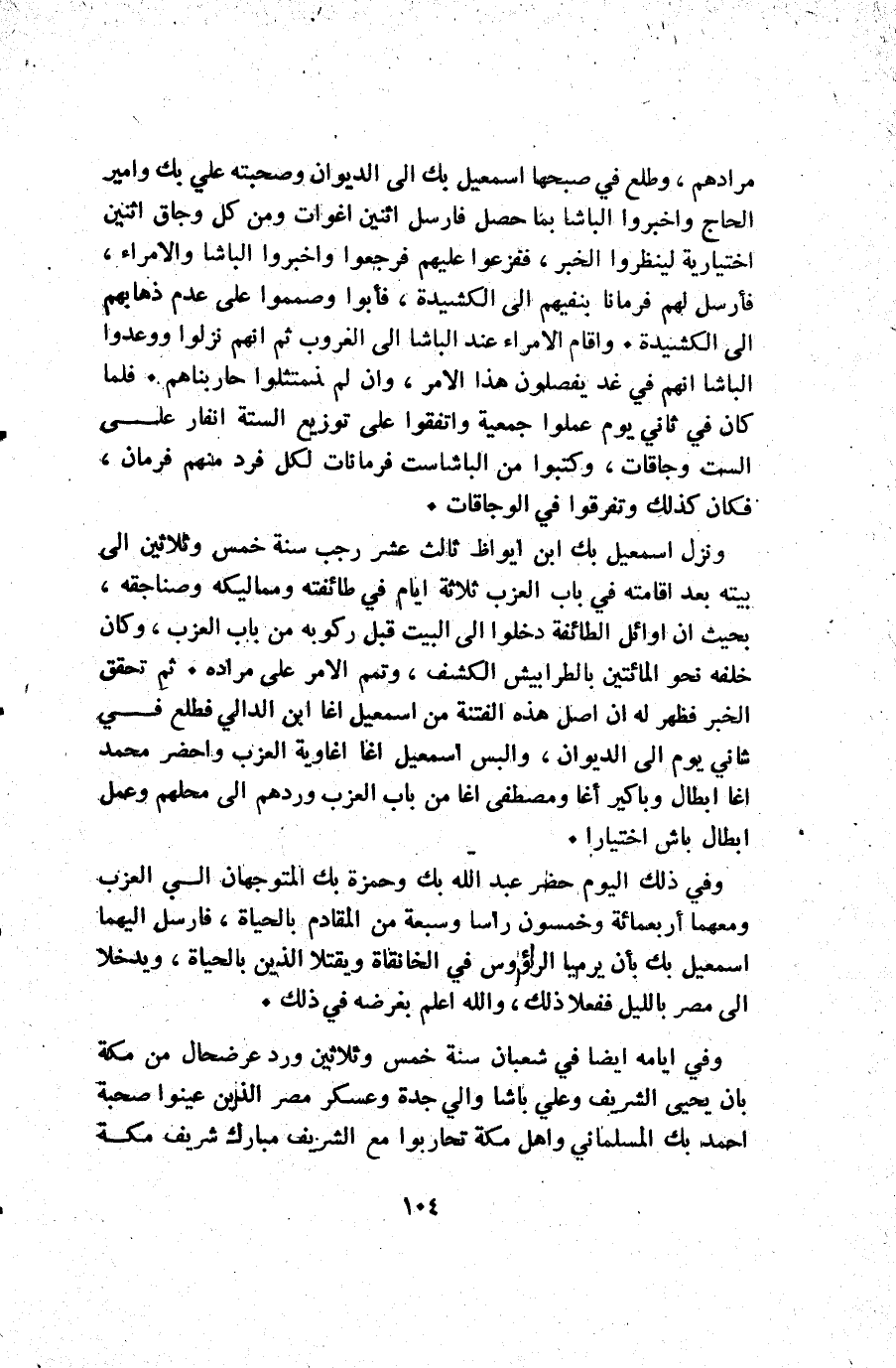 مرادهم وطلع في صبحها إسمعيل بك إلى الديوان وصحبته علي بك وأمير الحاج واخبروا الباشا بما حصل فأرسل اثنين اغوات ومن كل وجاق اثنين اختيارية لينظروا الخبر ففزعوا عليهم فرجعوا وأخبروا الباشا والأمراء فأرسل لهم فرمانا بنفيهم إلى الكشيدة فأبوا وصمموا على عدم ذهابهم إلى الكشيدة. وأقام الأمراء عند الباشا إلى الغروب ثم إنهم نزلوا ووعدوا الباشا أنهم في غد يفصلون هذا الأمر وإن لم يمتثلوا حاربناهم. فلما كان في ثاني يوم عملوا جمعية واتفقوا على توزيع الستة انفار على الست وجاقات وكتبوا من الباشا ست فرمانات لكل فرد منهم فرمان فكان كذلك وتفرقوا في الوجاقات.