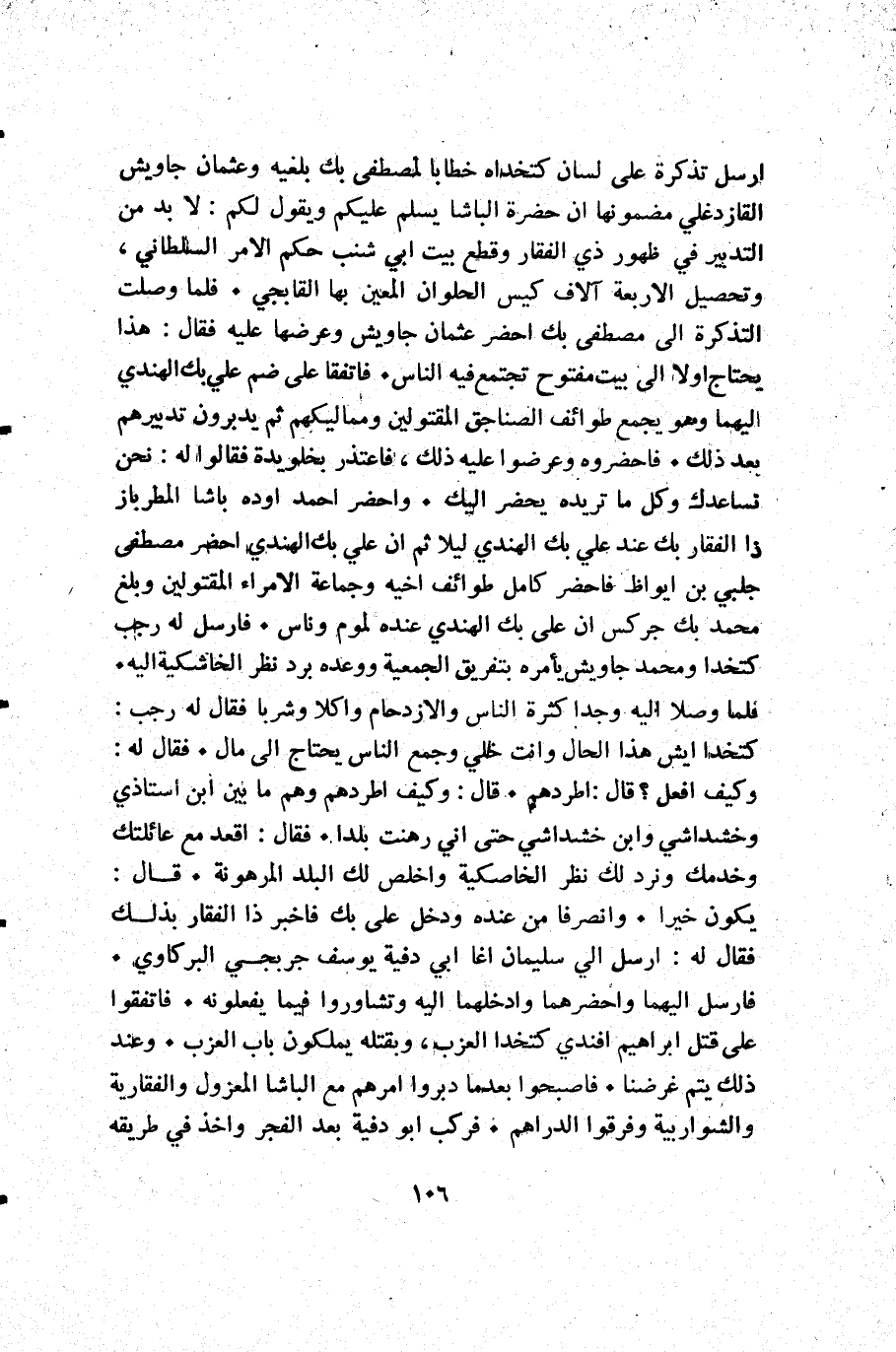 أرسل تذكرة على لسان كتخداه خطابا لمصطفى بك بلغيه وعثمان جاويش القازدغلي مضمونها أن حضرة الباشا يسلم عليكم ويقول لكم: لا بد من التدبير في ظهور ذي الفقار وقطع بيت أبي شنب حكم الأمر السلطاني وتحصيل الأربعة آلاف كيس الحلوان المعين بها القابجي. فلما وصلت التذكرة إلى مصطفى بك أحضر عثمان جاويش وعرضها عليه فقال: هذا يحتاج أولا إلى بيت مفتوح تجتمع فيه الناس. فاتفقا على ضم علي بك الهندي اليهما وهو يجمع طوائف الصناجق المقتولين ومماليكهم ثم يدبرون تدبيرهم بعد ذلك. فاحضروه وعرضوا عليه ذلك فاعتذر بخلويدة فقالوا له: نحن نساعدك وكل ما تريده يحضر اليك. واحضر أحمد اوده باشا المطرباز ذا الفقار بك عند علي بك الهندي ليلا ثم أن علي بك الهندي أحضر مصطفى جلبي بن ايواظ فاحضر كامل طوائف أخيه وجماعة الأمراء المقتولين وبلغ محمد بك جركس أن علي بك الهندي عنده لموم وناس. فأرسل له رجب كتخدا ومحمد جاويش يأمره بتفريق الجمعية ووعده برد نظر الخاشكية إليه. فلما وصلا إليه وجدا كثرة الناس والازدحام وأكلا وشربا فقال له رجب كتخدا ايش: هذا الحال وانت اعتقدانها خلي وجمع الناس يحتاج إلى مال. فقال له: وكيف افعل قال: اطردهم. قال: وكيف اطردهم وهم ما بين ابن أستاذي وخشداشي وابن خشداشي حتى إني رهنت بلدا. فقال أقعد مع عائلتك وخدمك ونرد لك نظر الخاصكية واخلص لك البلد المرهونة. قال: يكون خيرا. وانصرفا من عنده ودخل علي بك فاخبر ذا الفقار بذلك فقال له: أرسل الي سليمان اغا أبي دفية يوسف جربجي البركاوي. فأرسل اليهما واحضرهما وادخلهما إليه وتشاوروا فيما يفعلونه. فاتفقوا على قتل إبراهيم افندي كتخدا العزب وبقتله يملكون باب العزب. وعند ذلك يتم غرضنا. فاصبحوا بعدما دبروا أمرهم مع الباشا المعزول والفقارية والشواربية وفرقوا الدراهم. فركب أبو دفية بعد الفجر وأخذ في طريقه