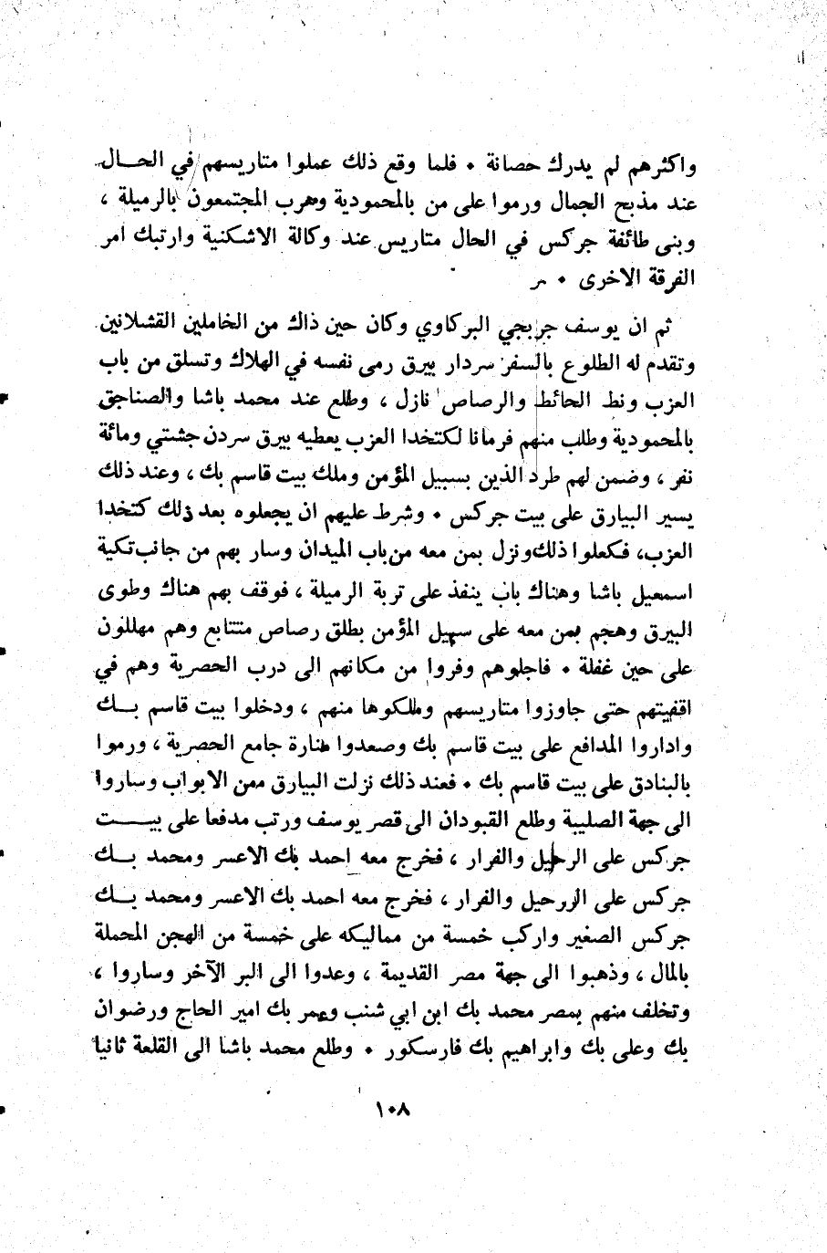 وأكثرهم لم يدرك حصانه. فلما وقع ذلك عملوا متاريسهم في الحال عند مذبح الجمال ورموا على من بالمحمودية وهرب المجتمعون بالرميلة وبنى طائفة جركس في الحال متاريس عند وكالة الأشكنية وارتبك أمر الفرقة الاخرى.