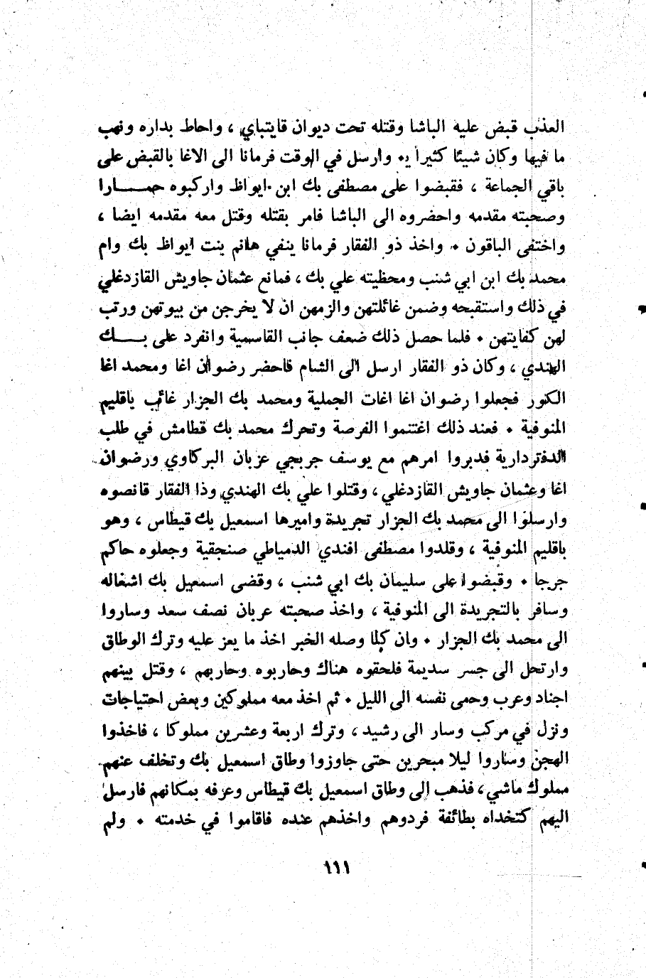 العذب قبض عليه الباشا وقتله تحت ديوان قايتباي واحاط بداره ونهب ما فيها وكان شيئا كثيرا. وأرسل في الوقت فرمانا إلى الأغا بالقبض على باقي الجماعة فقبضوا على مصطفى بك ابن ايواط واركبوه حمارا وصحبته مقدمه واحضروه إلى الباشا فامر بقتله وقتل معه مقدمه أيضا واختفى الباقون. وأخذ ذو الفقار فرمانا ينفي هانم بنت ابواظ بك وام محمد بك ابن أبي شنب ومحظيته علي بك فمانع عثمان جاويش القازدغلي في ذلك واستقبحه وضمن غائلتهن والزمهن أن لا يخرجن من بيوتهن ورتب لهن كفايتهن. فلما حصل ذلك ضعف جانب القاسمية وانفرد علي بك الهندي وكان ذو الفقار أرسل إلى الشام فاحضر رضوان اغا ومحمد اغا الكور فجعلوا رضوان اغا اغات الجملية ومحمد بك الجزار غائب باقليم المنوفية. فعند ذلك اغتنموا الفرصة وتحرك محمد بك قطامش في طلب الدفتردارية فدبروا أمرهم مع يوسف جربجي عزبان البركاوي ورضوان اغا وعثمان جاويش القازدغلي وقتلوا علي بك الهندي وذا الفقار قانصوه وأرسلوا إلى محمد بك الجزار تجريدة واميرها إسمعيل بك قيطاس وهو باقليم المنوفية وقلدوا مصطفى افندي الدمياطي صنجقية وجعلوه حاكم جرجا. وقبضوا على سليمان بك أبي شنب وقضى إسمعيل بك اشغاله وسافر بالتجريدة إلى المنوفية وأخذ صحبته عربان نصف سعد وساروا إلى محمد بك الجزار. وأن كلما وصله الخبر أخذ ما يعز عليه وترك الوطاق وارتحل إلى جسر سديمة فلحقوه هناك وحاربوه وحاربهم وقتل بينهم أجناد وعرب وحمى نفسه إلى الليل. ثم أخذ معه مملكوين وبعض احتياجات ونزل في مركب وسار إلى رشيد وترك أربعة وعشرين مملوكا فأخذوا الهجن وساروا ليلا مبحرين حتى جاوزوا وطاق إسمعيل بك وتخلف عنهم مملوك ماشي فذهب إلى وطاق إسمعيل بك قيطاس وعرفه بمكانهم فأرسل إليهم كتخداه بطائفة فردوهم واخذهم عنده فاقاموا في خدمته. ولم