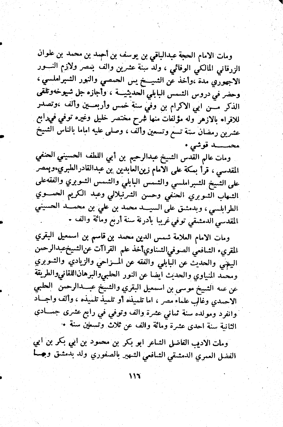 ومات الإمام الحجة عبد الباقي بن يوسف بن أحمد بن محمد بن علوان الزرقاني المالكي الوفائي ولد سنة عشرين وألف بمصر ولازم النور الاجهوري مدة وأخذ عن الشيخ يس الحمصي والنور الشبراملسي وحضر في دروس الشمس البابلي الحديثية وأجازه جل شيوخه وتلقى الذكر من أبي الاكرام توفي سنة خمس وأربعين وألف وتصدر للاقراء بالأزهر وله مؤلبفات منها شرح مختصر خليل وغيره توفي في رابع عشرين رمضان سنة تسع وتسعين وألف وصلى عليه إماما بالناس الشيخ محمد قوشي.