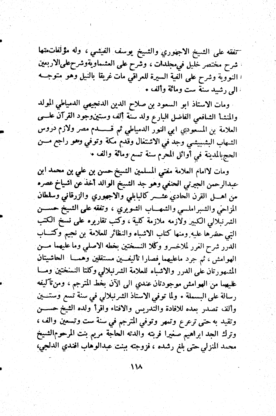 ومات الإمام العلامة مفتي المسلمين الشيخ حسن بن علي بن محمد ابن عبد الرحمن الجيرتي الحنفي وهو جد الشيخ الوالد أخذ عن أشياخ عصره من أهل القرن الحادي عشر كالبابلي والاجهوري والزرقاني وسلطان المزاحي والشبراملسي والشهاب الشويري وتفقه على الشيخ حسن الشرنبلالي الكبير ولازمه ملازمة كلية وكتب تقاريره على نسخ الكتب التي حضرها عليه ومنها كتاب الأشباه والنظائر للعلامة بن نجيم وكتاب الدرر شرح الغرر لملاخسرو وكلا النسختين بخطه الأصلي وما عليهما من الهوامش ثم جرد ما عليهما فصارا تأليفين مستقلين وهما الحاشيتان المشهورتان على الدرر والاشباه للعلامة الشرنبلالي وكلتا النسختين وما عليهما من الهوامش موجودتان عندي إلى الآن بخط المترجم ومن تآليفه رسالة على البسملة. ولما توفي الأستاذ الشرنبلالي في سنة تسع وستين وألف تصدر بعده للافادة والتدريس والافتاء واقرأ ولده الشيخ حسن وتقيد به حتى ترعرع وتمهر وتوفي المترجم في سنة ست وتسعين وألف وترك الجد إبراهيم صغيرا فربته والدته الحاجة مريم بنت المرحوم الشيخ محمد المنزلي حتى بلغ رشده فزوجته ببنت عبد الوهاب افندي الدلجي.