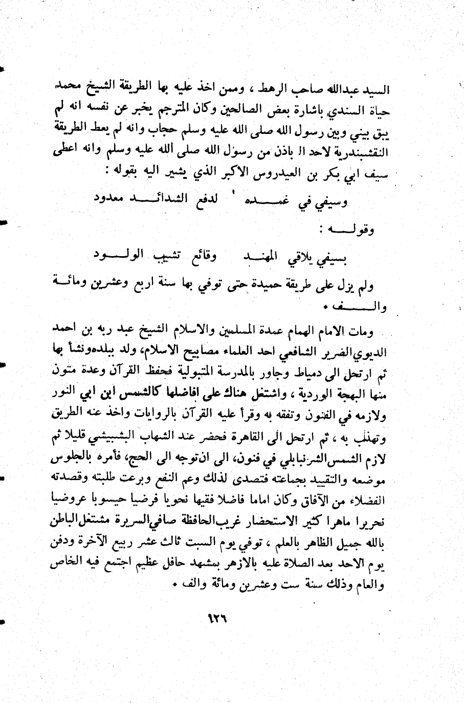 ومات الإمام الهمام عمدة المسلمين والإسلام الشيخ عبد ربه بن أحمد الديوي الضرير الشافعي أحد العلماء مصابيح الإسلام ولد ببلده ونشأ بها ثم ارتحل إلى دمياط وجاور بالمدرسة المتبولية فحفظ القرآن وعدة متون منها البهجة الوردية واشتغل هناك على أفاضلها كالشمس ابن أبي النور ولازمه في الفنون وتفقه به وقرأ عليه القرآن بالروايات وأخذ عنه الطريق وتهذب به ثم ارتحل إلى القاهرة فحضر عند الشهاب البشبيشي قليلا ثم لازم الشمس الشرنبابلي في فنون إلى أن توجه إلى الحج فأمره بالجلوس موضعه والتقييد بجماعته فتصدى لذلك وعم النفع وبرعت طلبته وقصدته الفضلاء من الآفاق وكان إماما فاضلا فقيها نحويا فرضيا حيسوبا عروضيا نحريرا ماهرا كثير الأستحضار غريب الحافظة صافي السريرة مشتغل الباطن بالله جميل الظاهر بالعلم توفي يوم السبت ثالث عشر ربيع الآخرة ودفن يوم الأحد بعد الصلاة عليه بالأزهر بمشهد حافل عظيم اجتمع فيه الخاص والعام وذلك سنة ست وعشرين ومائة وألف.