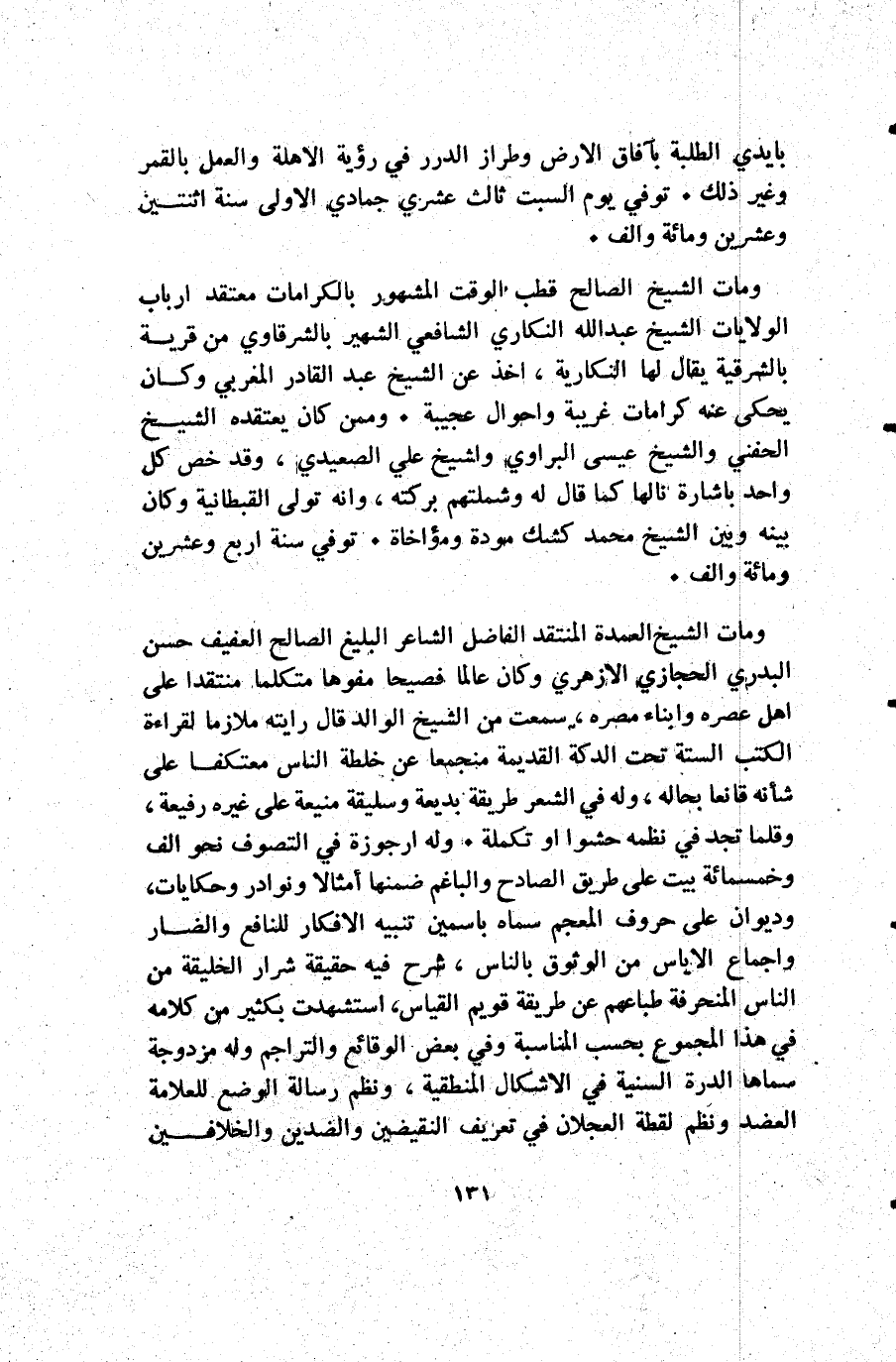 ومات الشيخ العمدة المنتقد الفاضل الشاعر البليغ الصالح العفيف حسن البدري الحجازي الأزهري وكان عالما فصيحا مفوها متكلما منتقدا على أهل عصره وابناء مصره سمعت من الشيخ الوالد قال: رأيته ملازما لقراءة الكتب الستة تحت الدكة القديمة منجمعا عن خلطة الناس معتكفا على شأنه قانعا بحاله وله في الشعر طريقة بديعة وسليقة منيعة على غيره رفيعة وقلما تجد في نظمه حشوا أو تكلمه. وله ارجوزة في التصوف نحو ألف وحمسمائة بيت على طريق الصادح والباغم ضمنها أمثالا ونوادر وححكايات وديوان على حروف المعجم سماه باسمين تنبيه الافكار للنافع والضار واجماع الاياس من الوثوق بالناس شرح فيه حقيقة شرار الخليفة من الناس المنحرفة طباعهم عن طريقة قويم القياس استشهدت بكثير من كلامه في هذا المجموع بحسب المناسبة وفي بعض الوقائع والتراجم وله مزدوجة سماها الدرة السنية في الأشكال المنطقية ونظم رسالة الوضع للعلامة العضد ونظم لقطة العجلان في تعريف النقيضين والضدين والخلافين.