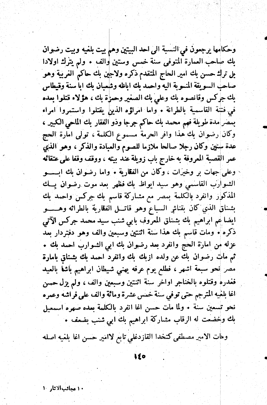 وحكامها يرجعون في النسبة إلى أحد البيتين وهم بيت بلغيه وبيت رضوان بك صاحب العمارة المتوفى سنة خمس وستين وألف. ولم يترك أولادا بل ترك حسن بك أمير الحاج المتقدم ذكره ولاجين بك حاكم الغربية وهو صاحب السويقة المنسوبة إليه وأحمد بك اباظه وشعبان بك أبا سنة وقيطاس بك جركس وقانصوه بك وعلي بك الصغير وحمزة بك هؤلاء قتلوا بعده في فتنة القاسمية بالطرانة. واما أمراؤه الذين يقتلوا واستمروا أمراء بمصر مدة طويلة فهم محمد بك حاكم جرجا وذو الفقار بك الماحي الكبير وكان رضوان بك هذا وافر الحرمة مسموع الكلمة تولى إمارة الحج عدة سنين وكان رجلا صالحا ملازما للصوم والعبادة والذكر وهو الذي عمر القصبة المعروفة به خارج باب زويلة عند بيته ووقف وقفا على عتقائه وعلى جهات بر وخيرات وكان من الفقارية. واما رضوان بك أبو الشوارب القاسمي وهو سيد ايواظ بك فظهر بعد موت رضوان بك المذكور وانفرد بالكلمة بمصر مع مشاركة قاسم بك جركس وأحمد بك بشناق الذي كان بقناشر السباع وهو قاتل الفقارية بالطراثة وهو أيضا عم إبراهيم بك بشناق المعروف بابي شنب سيد محمد جركس الآتي ذكره. ومات قاسم بك هذا سنة اثنتين وسبعين وألف وهو دفتردار بعد عزله من إمارة الحج وانفرد بعد رضوان بك أبي الشوارب أحمد بك. ثم مات رضوان بك عن ولده ازبك بك وانفرد أحمد بك بشناق بامارة مصر نحو سبعة أشهر فطلع يوم عرفه يهني شيطان إبراهيم باشا بالعيد فغدره وقتلوه بالخناجر أواخر سنة اثنتين وسبعين وألف ولم يزل حسن اغا بلغيه المترجم حتى توفي سنة خمس عشرة ومائة وألف على فراشه وعمره نحو تسعين سنة. ولما مات حسن اغا انفرد بالكلمة بعده صهره إسمعيل بك وخضعت له الرقاب مشاركة إبراهيم بك أبي شنب بضعف.