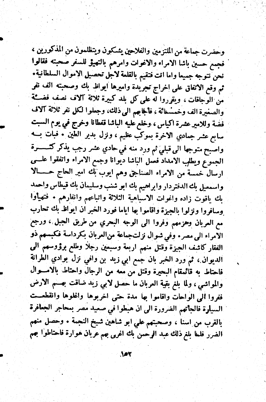 وحضرت جماعة من الملتزمين والفلاحين يشكون ويتظلمون من المذكورين فجمع حسين باشا الأمراء والاغوات وأمرهم بالتهيؤ للسفر صحبته فقالوا نحن نتوجه جميعا وأما أنت فتقيم بالقلعة لأجل تحصيل الأموال السلطانية. ثم وقع الاتفاق على اخراج تجريدة واميرها ايواظ بك وصحبته ألف نفر من الوجاقات ويقرروا له على كل بلد كبيرة ثلاثة آلاف نصف فضة والصغيرة ألف وخمسمائة فأجابهم إلى ذلك وجعلوا لكل نفر ثلاثة آلاف فضة وللامير عشرة أكياس وخلع عليه الباشا قفطانا وخرج في يوم السبت سابع عشر جمادي الأخرة بموكب عظيم ونزل بدير الطين. فبات به وأصبح متوجها إلى قبلي ثم ورد منه في حادي عشر رجب يذكر كثرة الجموع ويطلب الامداد فعمل الباشا ديوانا وجمع الأمراء واتفقوا على ارسال خمسة من الأمراء الصناجق وهم أيوب بك أمير الحاج حالا وإسمعيل بك الدفتردار وإبراهيم بك أبو شنب وسليمان بك قيطاس وأحمد بك ياقوت زاده واغوات الأسباهية الثلاثة واتباعهم وانفارهم. فتهيأوا وسافروا ونزلوا بالجيزة وأقاموا بها أياما فورد الخبر أن ايواظ بك تحارب مع العربان وهزمهم وفروا إلى الوجه البحري من طريق الجبل ورجع الأمراء إلى مصر. وفي شوال نزلت جماعة من العربان بكرداسة فكسبهم ذو الفقار كاشف الجيزة وقتل منهم أربعة وسبعين رجلا وطلع برؤوسهم إلى الديوان ثم ورد الخبر بان جمع أبي زيد بن وافي نزل بوادي الطرانة فاحتاط به قائمقام البحيرة وقتل من معه من الرجال واحتاط بالاموال والمواشي ولما بلغ بقية العربان ما حصل لأبي زيد ضاقت بهم الأرض ففروا إلى الواحات وأقاموا بها مدة حتى اخربوها واغلوها وانقطعت السيارة فالجأتهم الضرورة إلى أن هبطوا في صعيد مصر بمحاجر الجعافرة بالقرب من اسنا وصحبتهم علي أبو شاهين شيخ النجمة. وحصل منهم الضرر فلما بلغ ذلك عبد الرحمن بك اغرى بهم عربان هوارة فاحتاطوا بهم