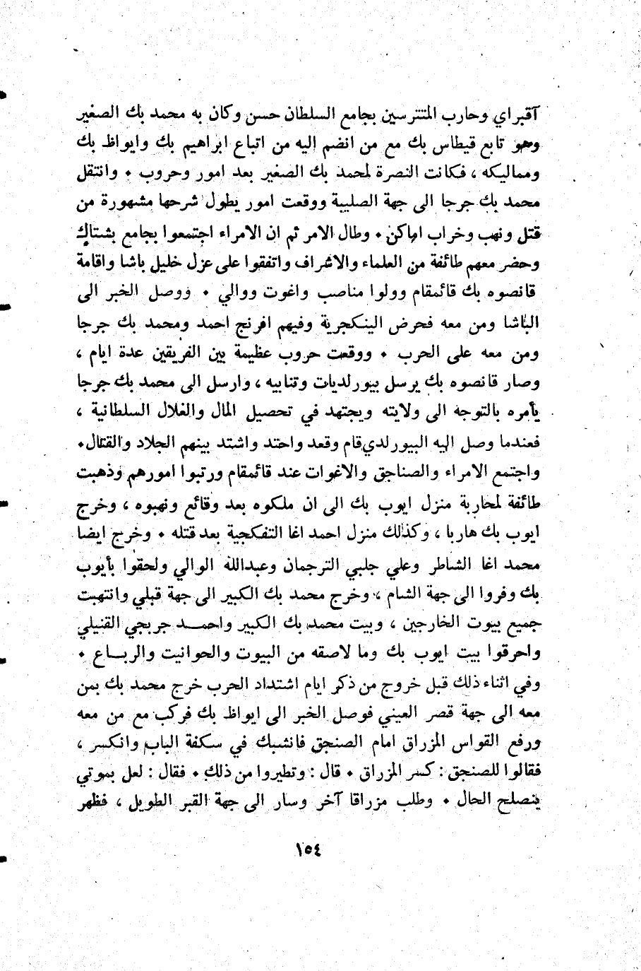 آقبراي وحارب المتترسين بجامع السلطان حسن وكان به محمد بك الصغير وهو تابع قيطاس بك مع من انضم إليه من اتباع إبراهيم بك وأيواظ بك ومماليكه فكانت النصرة لمحمد بك الصغير بعد أمور وحروب. وانتقل محمد بك جرجا إلى جهة الصليبة ووقعت أمور يطول شرحها مشهورة من قتل ونهب وخراب اماكن. وطال الأمر ثم أن الأمراء اجتمعوا بجامع بشتاك وحضر معهم طائفة من العلماء والاشراف واتفقوا على عزل خليل باشا وأقامة قانصوه بك قائمقام وولوا مناصب واغوت ووالي. ووصل الخبر إلى الباشا ومن معه فحرض الينكجرية وفيهم افرنج أحمد ومحمد بك جرجا ومن معه على الحرب. ووقعت حروب عظيمة بين الفريقين عدة أيام وصار قانصوه بك يرسل بيولديات وتنابيه وأرسل إلى محمد بك جرجا يأمره بالتوجه إلى ولايته ويجتهد في تحصيل المال والغلال السلطانية فعندما وصل إليه البيورلدي قام وقعد واحتد واشتد بينهم الجلاد والقتال. واجتمع الأمراء والصناجق والاغوات عند قائمقام ورتبوا أمورهم وذهبت طائفة لمحاربة منزل أيوب بك إلى أن ملكوه بعد وقائع ونهبوه وخرج أيوب بك هاربا وكذلك منزل أحمد اغا التفكجية بعد قتله. وخرج أيضا محمد اغا الشاطر وعلي جلبي الترجمان وعبد الله الوالي ولحقوا بأيوب بك وفروا إلى جهة الشام وخرج محمد بك الكبير إلى جهة قبلي وانتهبت جميع بيوت الخارجين وبيت محمد بك الكبير وأحمد جربجي القنيلي واحرقوا بيت أيوب بك وما لاصقه من البيوت والحوانيت والرباع. وفي اثناء ذلك خروج من ذكر أيام اشتداد الحرب خرج محمد بك بمن معه إلى جهة قصر العيني فوصل الخبر إلى ايواظ بك فركب مع من معه ورفع القواس المزراق إمام الصنجق فانشبك في سكفة الباب وانكسر فقالوا للصنجق كسر المزراق. قال: وتطيروا من ذلك. فقال لعل بموتي ينصلح الحال. وطلب مزراقا آخر وسار إلى جهة القبر الطويل فظهر