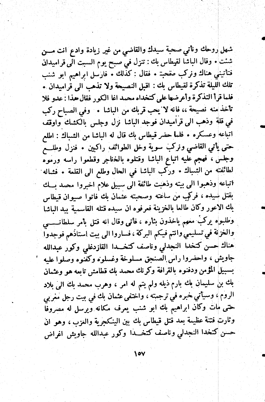 شهل روحك ونأتي صحبة سيدك والقاضي من غير زيادة وادع أنت من شئت. وقال الباشا لقيطاس بك: تنزل في صبح يوم السبت إلى قراميدان فتأتيني هناك ونركب صحبته. فقال كذلك. فأرسل إبراهيم أبو شنب تلك الليلة تذكرة لقيطاس بك أقبل النصيحة ولا تذهب إلى قراميدان. فلما قرأ التذكرة وأعرضها على كتخداه محمد اغا الكور فقال هذا عدو فلا تأخذ منه نصحية فإنه لا يحب قربك من الباشا. وفي الصباح ركب في قلة وذهب إلى قراميدان فوجد الباشا نزل وجلس بالكشك وأوقف اتباعه وعسكره. فلما حضر قيطاس بك قال له: الباشا من الشباك اطلع حتى يأتي القاضي ونركب سوية وخل الطوائف راكبين. فنزل وطلع وجلس فهجم عليه اتباع الباشا وقتلوه بالخناجر وقطعوا راسه ورموه لطائفته من الشباك. وركب الباشا في الحال وطلع إلى القلعة. فشاله اتباعه وذهبوا إلى بيته وذهبت طائفة إلى سبيل علام اخبروا محمد بك بقتل سيده فركب من ساعته وصحبته عثمان بك فاتوا صيوان قيطاس بك الاعور وكان طالعا بالخزينة فعرفوه أن سيده قتله القاسمية بيد الباشا وطلبوه يركب معهم ياخذون بثأره فأتى وقال: إنه قتل بأمر سلطاني والخزنة في تسليمي وانتم فيكم البركة فساروا إلى بيت أستاذهم فوجدوا هناك حسن كتخدا النجدلي وناصف كتخدا القازدغلي وكور عبد الله جاويش واحضروا راس الصنجق مسلوخة وغسلوه وكفنوه وصلوا عليه بسبيل المؤمن ودفنوه بالقرافة وكرنك محمد بك قطامش تابعه هو وعثمان بك سليمان بك بارم ذيله ولم يتم له أمر وهرب محمد بك إلى بلاد الروم وسيأتي خبره في ترجمته واختفى عثمان بك في بيت رجل مغربي حتى مات وكان إبراهيم بك أبو شنب يعرف مكانه ويرسل له مصروفا وثارت فتنة عظيمة بعد قتل قيطاس بك بين الينكجرية والعزب وهو أن حسن كتخدا النجدلي وناصف كتخدا وكور عبد الله جاويش أغراض