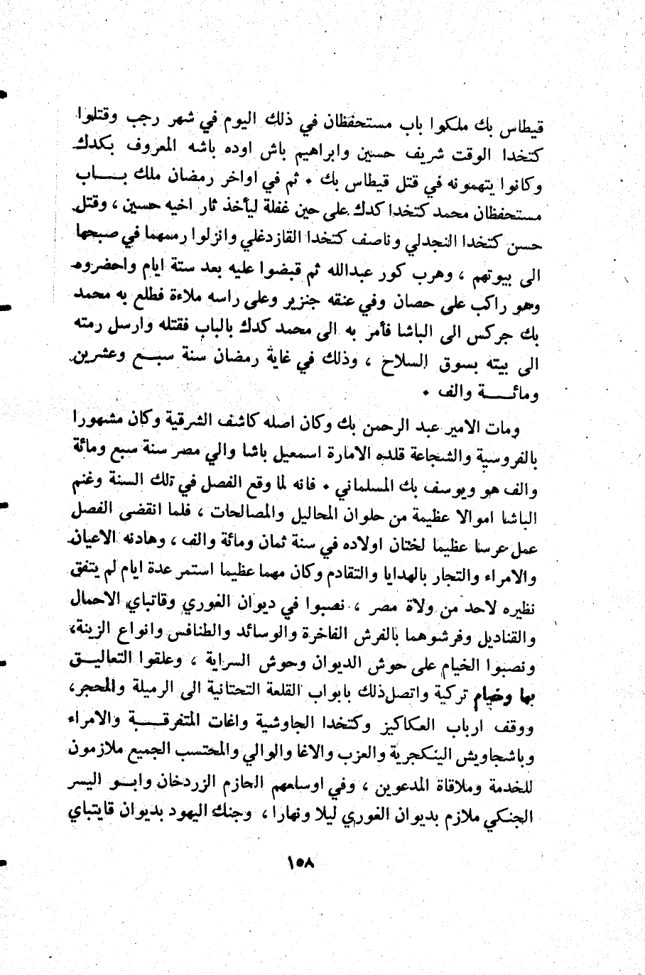 ومات الأمير عبد الرحمن بك وكان أصله كاشف الشرقية وكان مشهورا بالفروسية والشجاعة قلده الإمارة إسمعيل باشا والي مصر سنة سبع ومائة وألف هو ويوسف بك المسلماني. فانه لما وقع الفصل في تلك السنة وغنم الباشا أموالا عظيمة من حلوان المحاليل والمصالحات فلما انقضى الفصل عمل عرسا عظيما لختان أولاده في سنة ثمان ومائة وألف وهادنه الأعيان والأمراء والتجار بالهدايا والتقادم وكان مهما عظيما استمر عدة أيام لم يتفق نظيره لاحد من ولاة مصر نصبوا في ديوان الغوري وقاتباي الاحمال والقناديل وفرشوهما بالفرش الفاخرة والوسائد والطنافس وانواع الزينة ونصبوا الخيام على حوش الديوان وحوش السراية وعلقوا التعاليق بها وخيام تركية واتصل ذلك بأبواب القلعة التحتانية إلى الرميلة والمحجر ووقف أرباب العكاكيز وكتخدا الجاوشية واغات المتفرقة والأمراء وباشجاويش الينكجرية والعزب والاغا والوالي والمحتسب الجميع ملازمون للخدمة وملاقاة المدعوين وفي اوسلعهم الحازم الزردخان وابو اليسر الجنكي ملازم بديوان الغوري ليلا ونهارا وجنك اليهود بديوان قايتباي