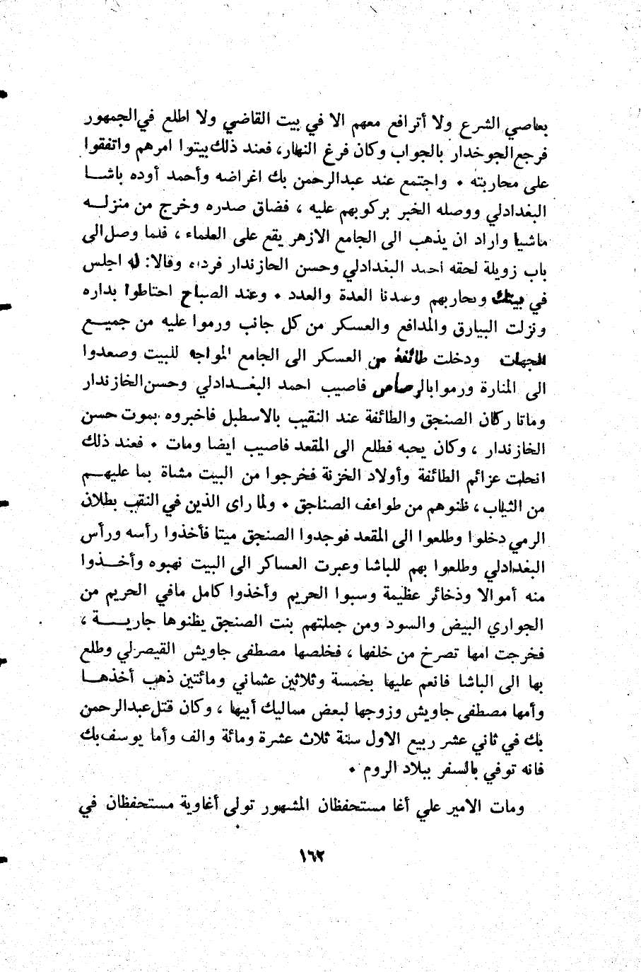 بعاصي الشرع ولا أترافع معهم إلا في بيت القاضي ولا اطلع في الجمهور فرجع الجوخدار بالجواب وكان فرغ النهار فعند ذلك بيتوا أمرهم واتفقوا على محاربته. واجتمع عند عبد الرحمن بك اغراضه وأحمد أوده باشا البغدادلي ووصله الخبر بركوبهم عليه فضاق صدره وخرج من منزله ماشيا واراد أن يذهب إلى الجامع الأزهر يقع على العلماء فلما وصل إلى باب زويلة لحقه أحمد البغدادلي وحسن الحازندار فرده وقالا له اجلس في بيتك ونحاربهم وعندنا العدة والعدد. وعند الصباح احتاطوا بداره ونزلت البيارق والمدافع والعسكر من كل جانب ورموا عليه من جميع الجهات ودخلت طائفة من العسكر إلى الجامع المواجه للبيت وصعدوا إلى المنارة ورموا بالرصاص فاصيب أحمد البغدادلي وحسن الخازندار وماتا وكان الصنجق والطائفة عند النقيب بالاسطبل فاخبروه بموت حسن الخازندار وكان يحبه فطلع إلى المقعد فاصيب أيضا ومات. فعند ذلك انحلت عزائم الطائفة وأولاد الخزنة فخرجوا من البيت مشاة بما عليهم من الثياب ظنوهم من طوائف الصناجق. ولما رأى الذين في النقب بطلان الرمي دخلوا وطلعوا إلى المقعد فوجدوا الصنجق ميتا فأخذوا رأسه ورأس البغدادلي وطلعوا بهم للباشا وعبرت العساكر إلى البيت نهبوه وأخذوا منه أموالا عظيمة وسبوا الحريم وأخذوا كامل ما في الحريم من بنت الصنجق يظنوها جارية فخرجت امها تصرخ من خلفها فخلصها مصطفى جاويش القيصرلي وطلع بها إلى الباشا فانعم عليها بخمسة وثلاثين عثماني ومائتين ذهب أخذها وأمها مصطفى جاويش وزوجها لبعض مماليك أبيها وكان قتل عبد الرحمن بك في ثاني عشر ربيع الأول سنة ثلاث عشرة ومائة وألف وأما يوسف بك فإنه توفي بالسفر ببلاد الروم.