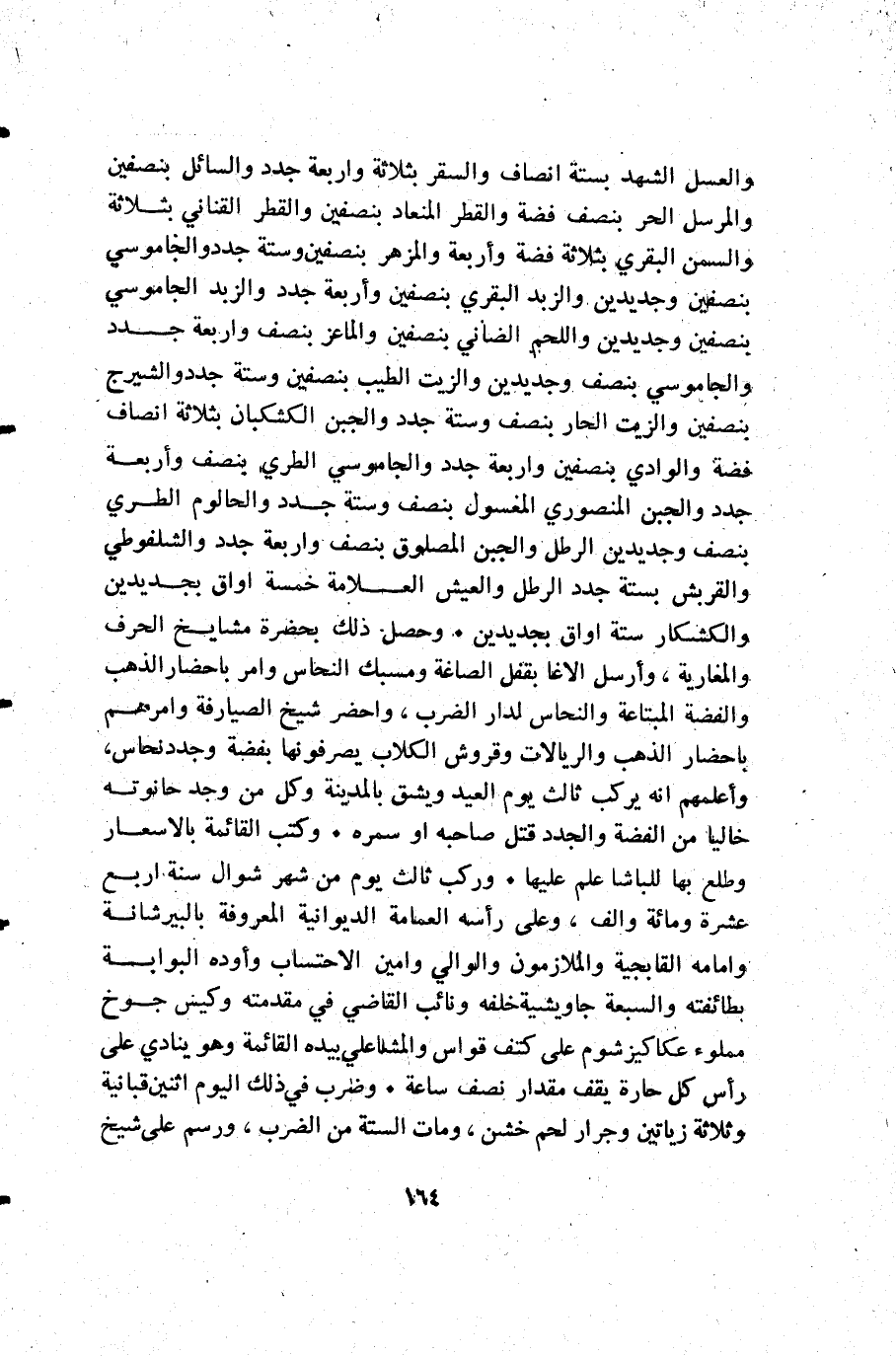 والعسل الشهد بستة انصاف والسقر بثلاثة وأربعة جدد والسائل بنصفين والمرسل الحر بنصف فضة والقطر المنعاد بنصفين والقطر القناني بثلاثة والسمن البقري بثلاثة فضة وأربعة والمزهر بنصفين وستة جدد والجاموسي بنصفين وجديدين والزبد البقري بنصفين وأربعة جدد والزبد الجاموسي بنصفين وجديدين واللحم الضاني بنصفين والماعز بنصف وأربعة جدد والجاموسي بنصف وجديدين والزيت الطيب بنصفين وستة جدد والشيرج بنصفين والزيت الحار بنصف وستة جدد والجبن الكشكبان بثلاثة انصاف فضة والوادي بنصفين وأربعة جدد والجاموسي الطري بنصف وأربعة جدد والجبن المنصوري المغسول بنصف وستة جدد والحالوم الطري بنصف وجديدين الرطل والجبن المصلوق بنصف وأربعة جدد والشلفوطي والقربش بستة جدد الرطل والعيش العلامة خمسة أواق بجديدين والكشكار ستة أواق بجديدين. وحصل ذلك بحضرة مشايخ الحرف والمغارية وأرسل الأغا بقفل الصاغة ومسبك النحاس وأمر باحضار الذهب والفضة المبتاعة والنحاس لدار الضرب واحضر شيخ الصيارفة وأمرهم باحضار الذهب والريالات وقروش الكلاب يضرفونها بفضة وجدد نحاس وأعلمهم أنه يركب ثالث يوم العيد ويشق بالمدينة وكل من وجد حانوته خاليا من الفضة والجدد قتل صاحبه أو سمره. وكتب القائمة بالاسعار وطلع بها للباشا علم عليها. وركب ثالث يوم من شهر شوال سنة أربع عشرة ومائة وألف وعلى رأسه العمامة الديوانية المعروفة بالبيرشانة وإمامه القابجية والملازمون والوالي وامين الاحتساب وأوده البوابة بطائفته والسبعة جاويشية خلفه ونائب القاضي في مقدمته وكيس جوخ مملوء عكاكيزشوم على كتف قواس والمشاعلي بيده القائمة وهو ينادي على رأس كل حارة يقف مقدار نصف ساعة. وضرب في ذلك اليوم اثنين قبانية وثلاثة زياتين وجرار لحم خشن ومات الستة من الضرب ورسم على شيخ