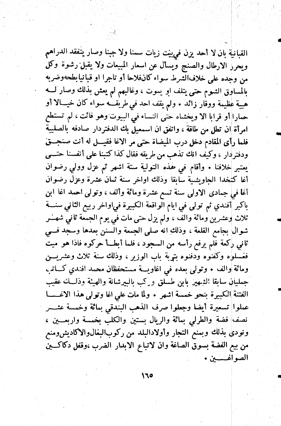 القبانية بان لا أحد يزن في بيت زيات سمنا ولا جبنا وصار يتفقد الدراهم ويحرر الارطال والصنج ويسأل عن اسعار المبيعات ولا يقبل رشوة وكل من وجده على خلاف الشرط سواء كان فلاحا أو تاجرا أو قبانيا بطحه وضربه بالمساوق الشوم حتى يتلف أو يموت وغالبهم لم يعش بذلك وصار له هيبة عظيمة ووقار زائد. ولم يقف أحد في طريقه سواء كان خيالا أو حمارا أو قرابا إلا ويخشاه حتى النساء في البيوت وهو فائت لم تستطع امرأة أن تطل من طاقة واتفق أن إسمعيل بك الدفتردار صادفه بالصليبة فلما رأى المقادم دخل درب الميضاة حتى مر الأغا فقيل له: أنت صنجق ودفتردار وكيف انك تذهب من طريقه فقال كذا كتبنا على أنفسنا حتى يعتبر خلافنا. وأقام في هذه التولية ستة أشهر ثم عزل وولي رضوان أغا كتخدا الجاويشية سابقا وذلك أواخر سنة ثمان عشرة وعزل رضوان أغا في جمادى الأولى سنة تسع عشرة ومائة وألف وتولى أحمد اغا ابن باكير أفندي ثم تولى في أيام الواقعة الكبيرة في أواخر ربيع الثاني سنة ثلاث وعشرين ومائة وألف ولم يزل حتى مات في يوم الجمعة ثاني شهر شوال بجامع القلعة وذلك أنه صلى الجمعة والسنن بعدها وسجد في ثاني ركعة فلم يرفع رأسه من السجود فلما أبطأ حركوه فإذا هو ميت فغسلوه وكفنوه ودفنوه بتربة باب الوزير وذلك سنة ثلاث وعشرين ومائة وألف. وتولى بعده في اغاوية مستحفظان محمد افندي كاتب جمليان سابقا الشهير بابن طسلق وركب بالبيرشانة والهيئة وذلك عقيب الفتنة الكبيرة بنحو خمسة أشهر. ولما مات علي اغا وتولى هذا الأغا عملوا تسعيرة أيضا وجعلوا صرف الذهب البندقي بمائة وخمسة عشر نصف فضة والطرلي بمائة والريال بستين والكلب بخمسة وأربعين ونودى بذلك وبمنع التجار وأولاد البلد من ركوب البغال والاكاديش ومنع من بيع الفضة بسوق الصاغة وإن لاتباع الأبرار الضرب وقفل دكاكين الصواغين.