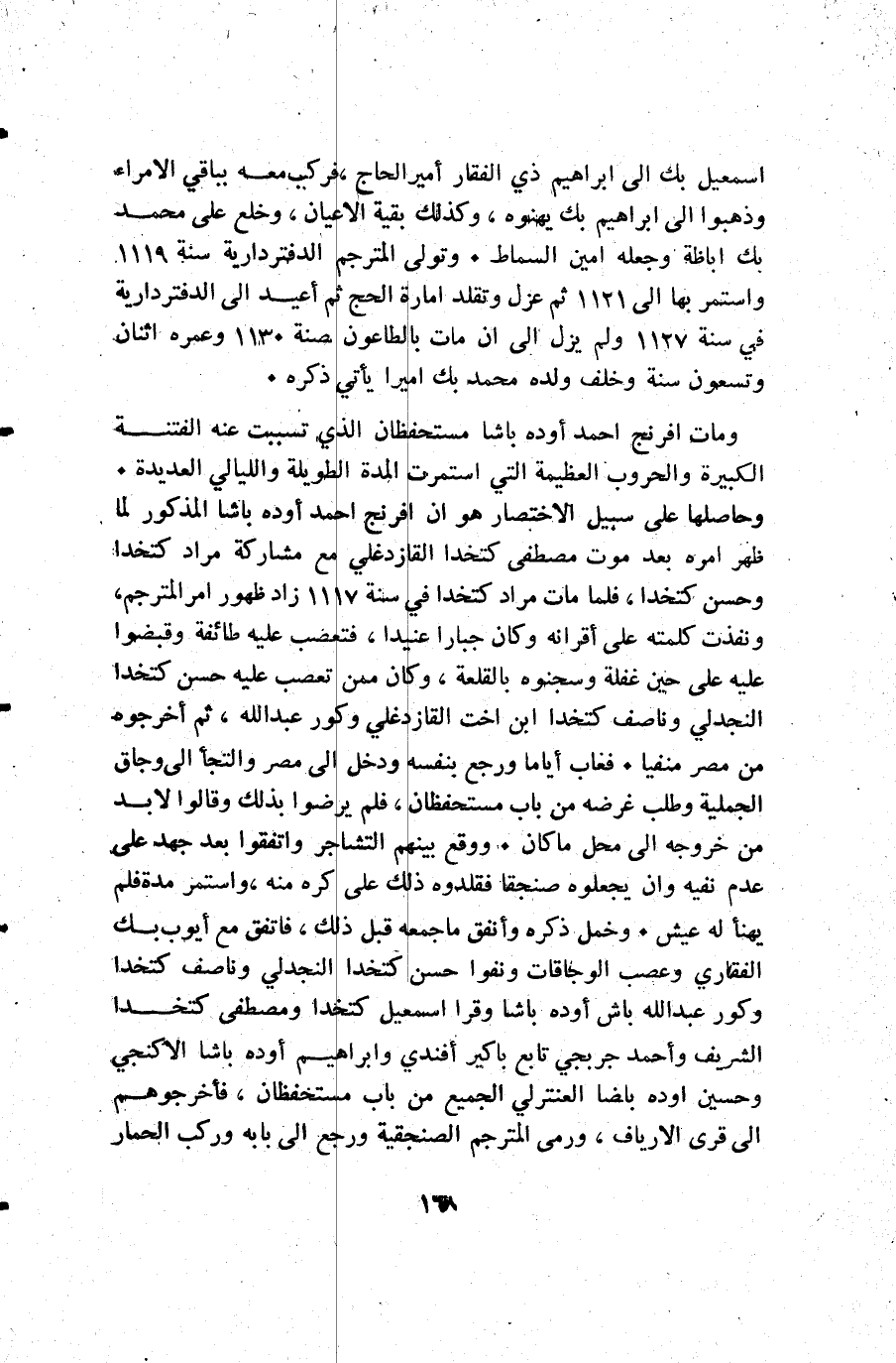 ومات افرنج أحمد اوده باشا مستحفظان الذي تسببت عنه الفتنة الكبيرة والحروب العظيمة التي استمرت المدة الطويلة والليالي العديدة. وحاصلها على سبيل الاختصار هو أن افرنج أحمد أوده باشا المذكور لما ظهر امره بعد موت مصطفى كتخدا القازدغلي مع مشاركة مراد كتخدا وحسن كتخدا فلما مات مراد كتخدا في سنة 1117 زاد ظهور أمر المترجم ونفذت كلمته على أقرانه وكان جبارا عنيدا فتعصب عليه طائفة وقبضوا عليه على حين غفلة وسجنوه بالقلعة وكان ممن تعصب عليه حسن كتخدا النجدلي وناصف كتخدا ابن اخت القازدغلي وكور عبد الله ثم أخرجوه من مصر منفيا. فغاب أياما ورجع بنفسه ودخل إلى مصر والتجأ إلى وجاق الجملية وطلب غرضه من باب مستحفظان فلم يرضوا بذلك وقالوا: لا بد من خروجه إلى محل ما كان. ووقع بينهم التشاجر واتفقوا بعد جهد على عدم نفيه وإن يجعلوه صنجقا فقلدوه ذلك على كره منه واستمر مدة فلم يهنأ له عيش. وخمل ذكره وانفق ما جمعه قبل ذلك فاتفق مع أيوب بك الفقاري وعصب الوجاقات ونفوا حسن كتخدا النجدلي وناصف كتخدا وكور عبد الله باش أوده باشا وقرا إسمعيل كتخدا ومصطفى كتخدا الشريف وأحمد جربجي تابع باكير أفندي وإبراهيم أوده باشا الاكنجي وحسين اوده بلضا العنترلي الجميع من باب مستحفظان فأخرجوهم إلى قرى الأرياف ورمى المترجم الصنجقية ورجع إلى بابه وركب الحمار